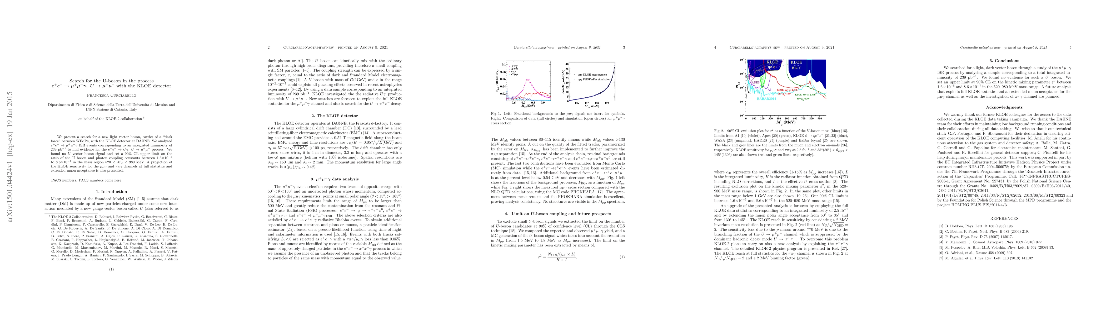 This paper reports a search for a new light vector boson, the U-boson, using the KLOE detector at \DA$\Phi$NE, finding no evidence for its existence in the $e^+ e^- \to \mu^+ \mu^- \gamma$ process. It sets an upper limit on the U boson's coupling to photons and projects future sensitivity improvements.