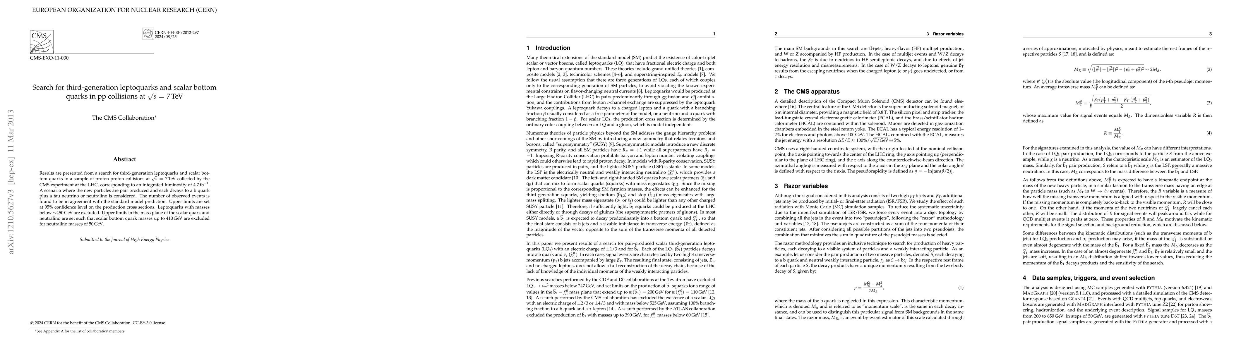 This paper reports on a search for third-generation leptoquarks and scalar bottom quarks in proton-proton collisions at 7 TeV using the CMS experiment at the LHC. No evidence of these particles was found, leading to exclusion of leptoquarks below 450 GeV and scalar bottom quarks up to 410 GeV for neutralino masses of 50 GeV.