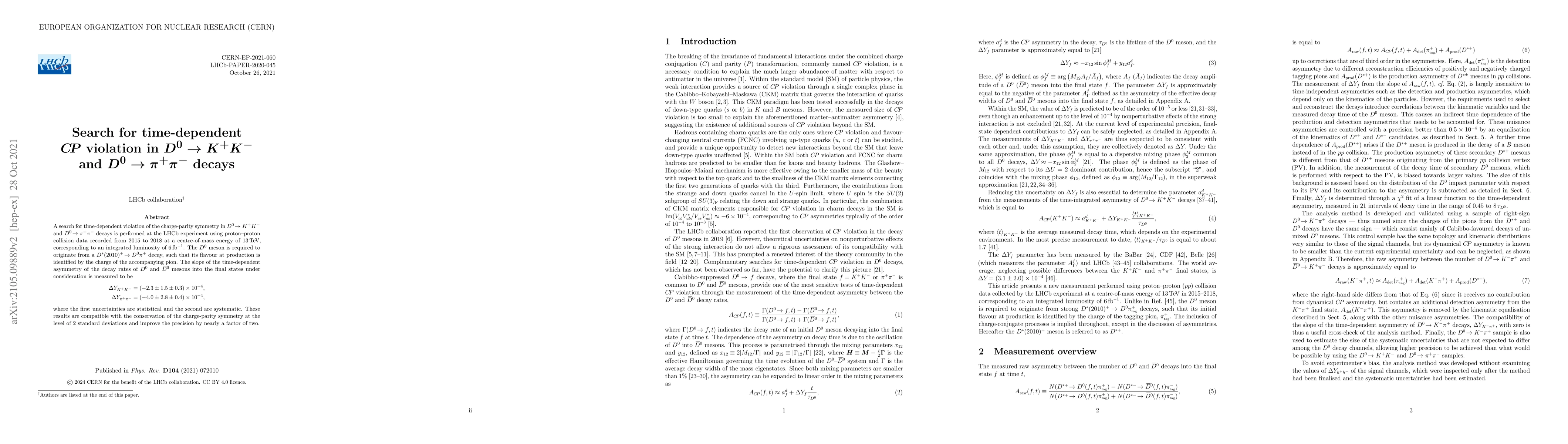 A search for time-dependent violation of the charge-parity symmetry in $D^0 \to K^+ K^-$ and $D^0 \to \pi^+ \pi^-$ decays is performed at the LHCb experiment using proton-proton collision data recorded from 2015 to 2018 at a centre-of-mass energy of 13 TeV, corresponding to an integrated luminosity of 6 fb$^{-1}$. The $D^0$ meson is required to originate from a $D^*(2010)^+ \to D^0 \pi^+$ decay, such that its flavour at production is identified by the charge of the accompanying pion. The slope of the time-dependent asymmetry of the decay rates of $D^0$ and $\bar{D}^0$ mesons into the final states under consideration is measured to be $\Delta Y_{K^+ K^-} = (-2.3 \pm 1.5 \pm 0.3) \times 10^{-4}$, $\Delta Y_{\pi^+ \pi^-} = (-4.0 \pm 2.8 \pm 0.4)\times 10^{-4}$, where the first uncertainties are statistical and the second are systematic. These results are compatible with the conservation of the charge-parity symmetry at the level of 2 standard deviations and improve the precision by nearly a factor of two.