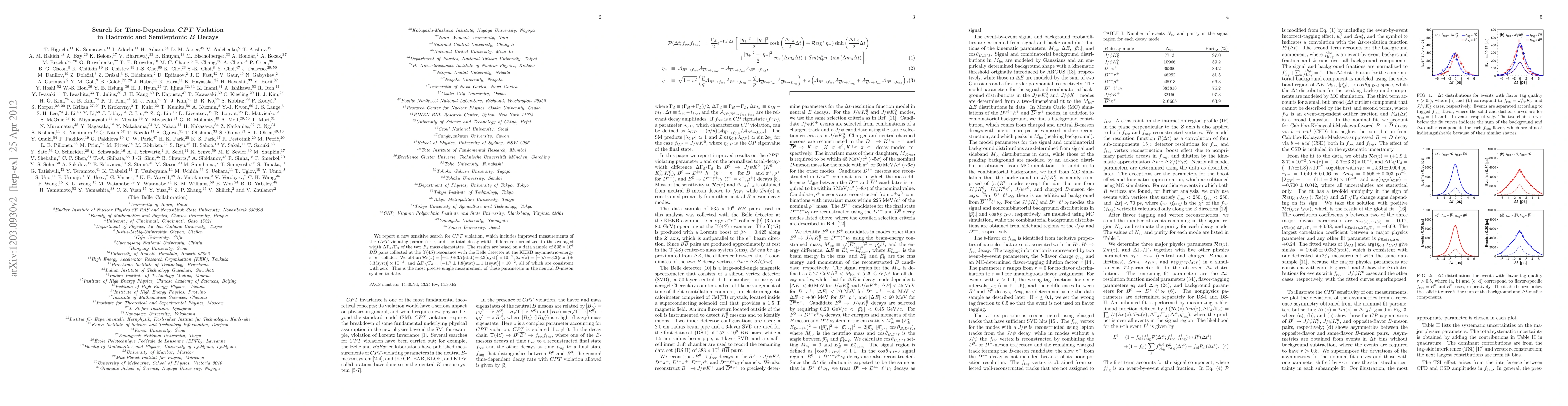 The Belle experiment at KEKB collider, using 535 x 10^6 BBbar pairs, reports a precise search for CPT violation in hadronic and semileptonic B decays. Findings include Re(z) = [+1.9 +/- 3.7 (stat) +/- 3.3 (syst)] x 10^{-2}, Im(z) = [-5.7 +/- 3.3 (stat) +/- 3.3 (syst)] x 10^{-3}, and DeltaGamma_d/Gamma_d = [-1.7 +/- 1.8 (stat) +/- 1.1 (syst)] x 10^{-2}. All results are consistent with zero, representing the most precise single measurement to date in the neutral B-meson system.
