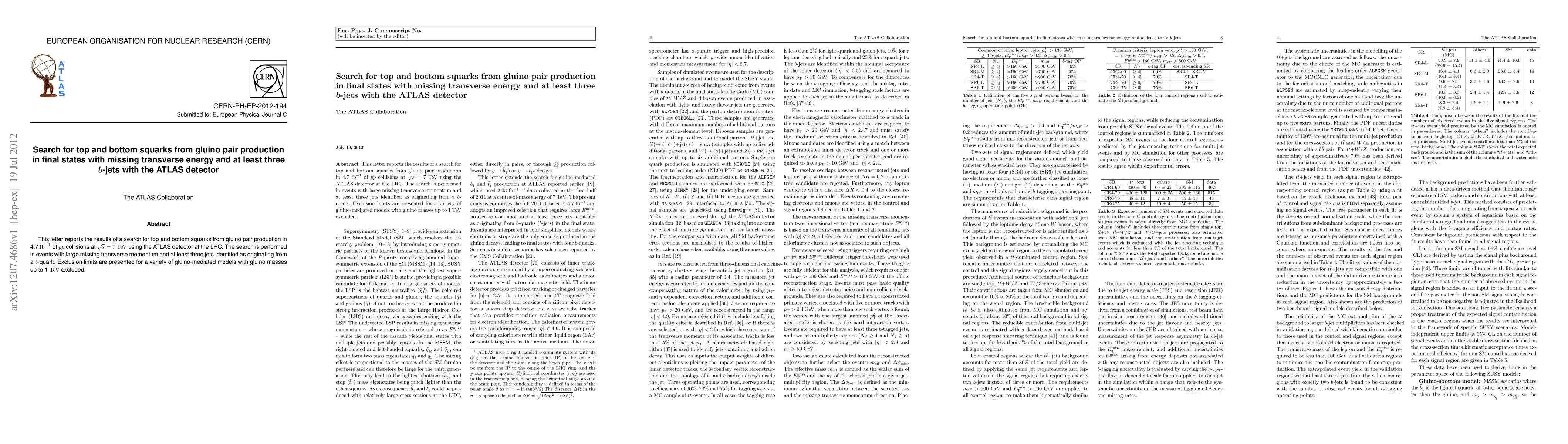 This paper reports on a search for top and bottom squarks via gluino pair production in ATLAS data from 7 TeV proton-proton collisions, focusing on events with significant missing transverse energy and three or more b-jets. Exclusion limits up to 1 TeV for gluino masses are established.