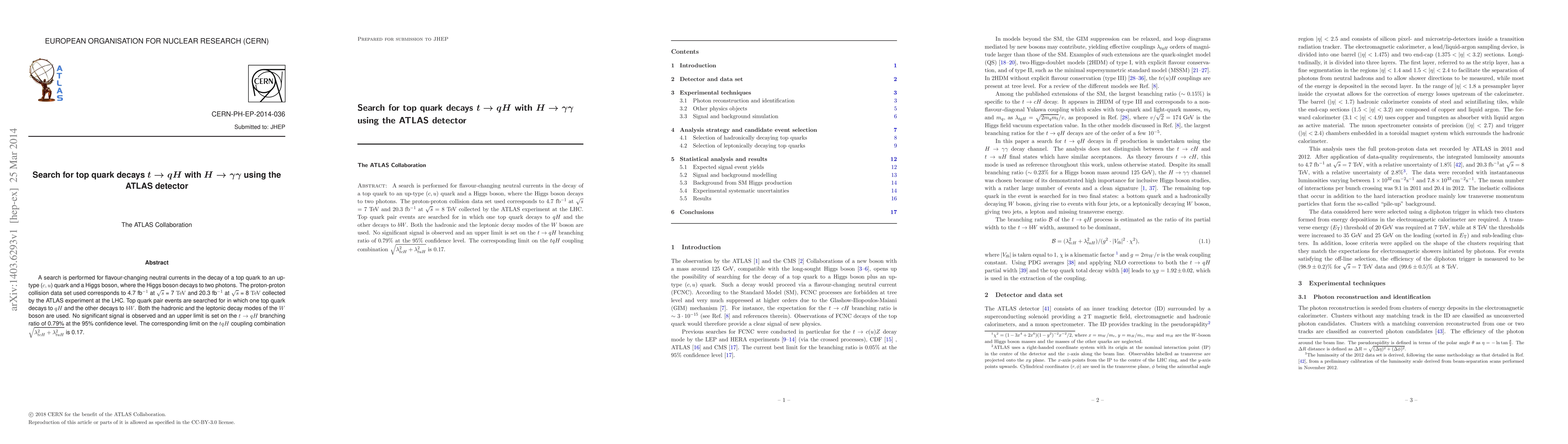 The ATLAS experiment searched for top quark decays $t\rightarrow qH$ with $H\to\gamma\gamma$ in proton-proton collisions at 7 and 8 TeV, but no significant signal was found, leading to an upper limit of 0.79% on the $t\rightarrow qH$ branching ratio at 95% confidence level.