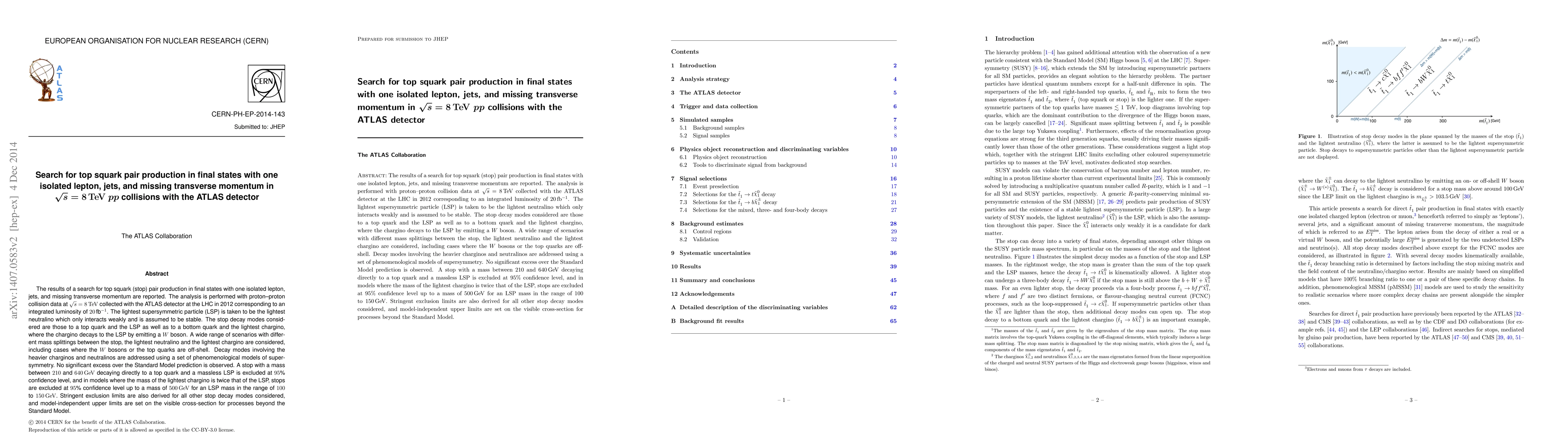 The results of a search for top squark (stop) pair production in final states with one isolated lepton, jets, and missing transverse momentum are reported. The analysis is performed with proton--proton collision data at $\sqrt{s} = 8$ TeV collected with the ATLAS detector at the LHC in 2012 corresponding to an integrated luminosity of $20$ fb$^{-1}$. The lightest supersymmetric particle (LSP) is taken to be the lightest neutralino which only interacts weakly and is assumed to be stable. The stop decay modes considered are those to a top quark and the LSP as well as to a bottom quark and the lightest chargino, where the chargino decays to the LSP by emitting a $W$ boson. A wide range of scenarios with different mass splittings between the stop, the lightest neutralino and the lightest chargino are considered, including cases where the $W$ bosons or the top quarks are off-shell. Decay modes involving the heavier charginos and neutralinos are addressed using a set of phenomenological models of supersymmetry. No significant excess over the Standard Model prediction is observed. A stop with a mass between $210$ and $640$ GeV decaying directly to a top quark and a massless LSP is excluded at $95$ % confidence level, and in models where the mass of the lightest chargino is twice that of the LSP, stops are excluded at $95$ % confidence level up to a mass of $500$ GeV for an LSP mass in the range of $100$ to $150$ GeV. Stringent exclusion limits are also derived for all other stop decay modes considered, and model-independent upper limits are set on the visible cross-section for processes beyond the Standard Model.