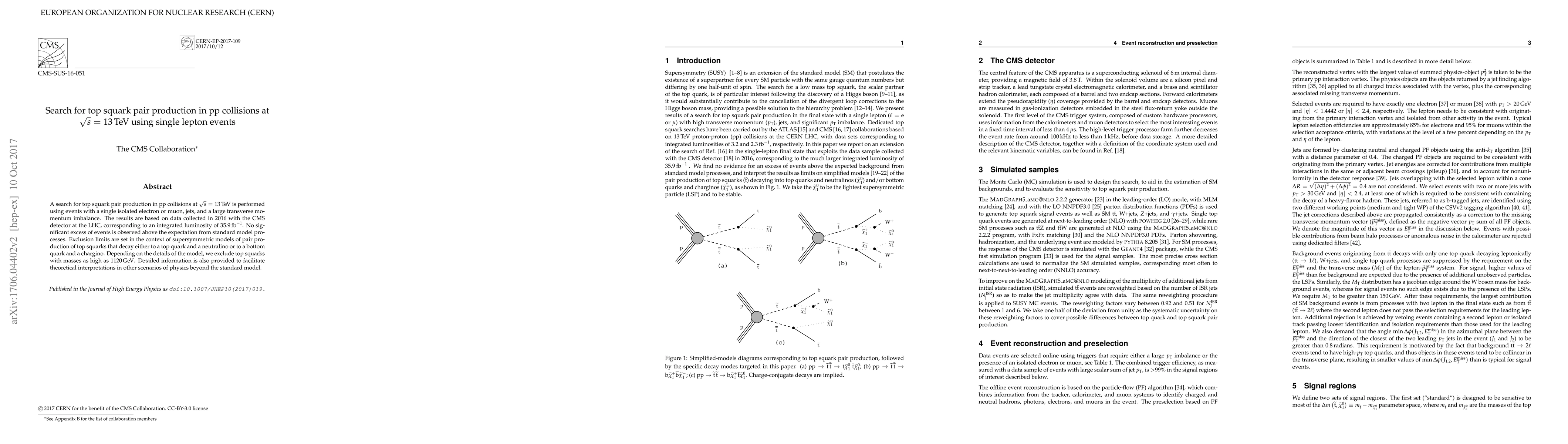 This paper reports a search for top squark pair production in proton-proton collisions at 13 TeV using single lepton events and data from the CMS detector at LHC. No significant excess is observed, leading to exclusion limits for top squark masses up to 1120 GeV in various supersymmetric models.