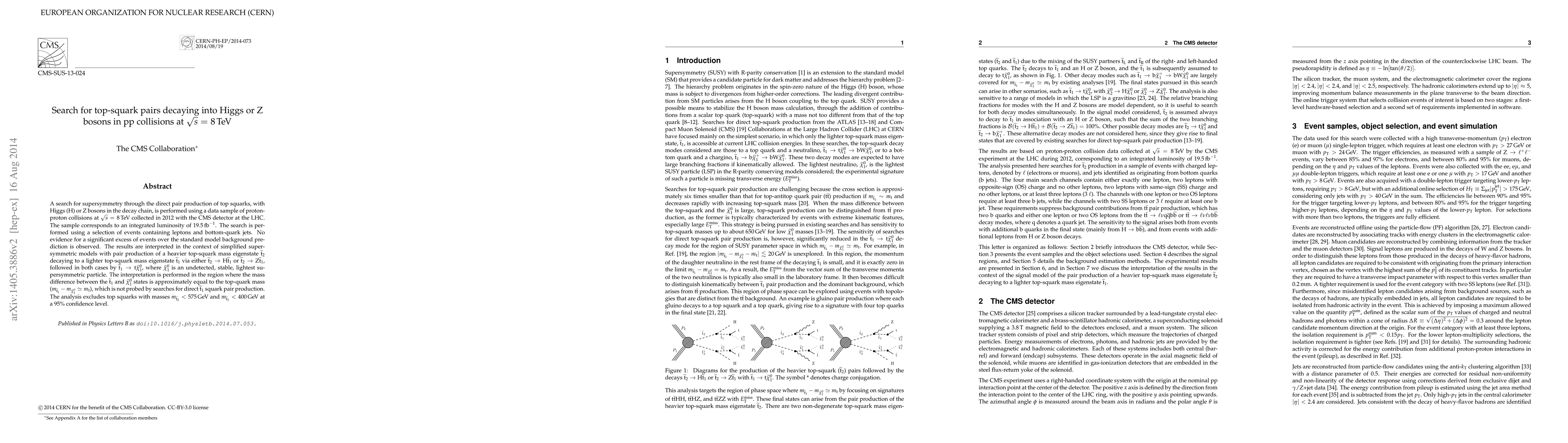 A search for supersymmetry through the direct pair production of top squarks, with Higgs (H) or Z bosons in the decay chain, is performed using a data sample of proton-proton collisions at sqrt(s) = 8 TeV collected in 2012 with the CMS detector at the LHC. The sample corresponds to an integrated luminosity of 19.5 inverse femtobarns. The search is performed using a selection of events containing leptons and bottom-quark jets. No evidence for a significant excess of events over the standard model background prediction is observed. The results are interpreted in the context of simplified supersymmetric models with pair production of a heavier top-squark mass eigenstate stop[2] decaying to a lighter top-squark mass eigenstate stop[1] via either stop[2] to H stop[1] or stop[2] to Z stop[1], followed in both cases by stop[1] to t neutralino, where neutralino is an undetected, stable, lightest supersymmetric particle. The interpretation is performed in the region where the mass difference between the stop[1] and neutralino states is approximately equal to the top-quark mass (m[stop[1]] - m[neutralino] ~= m[t]), which is not probed by searches for direct stop[1] squark pair production. The analysis excludes top squarks with masses m[stop[2]] < 575 GeV and m[stop[1]] < 400 GeV at a 95% confidence level.