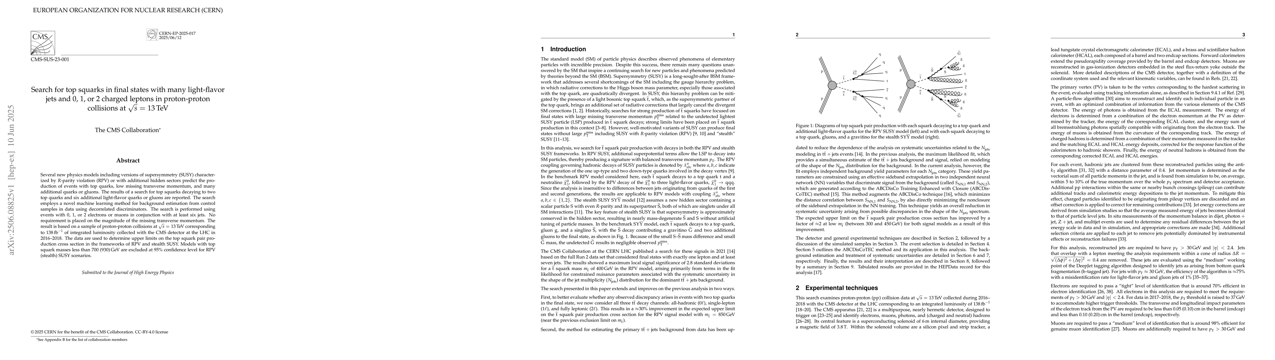 Researchers searched for top squarks in proton-proton collisions at 13 TeV, setting limits on supersymmetry models with high-energy top quark masses.