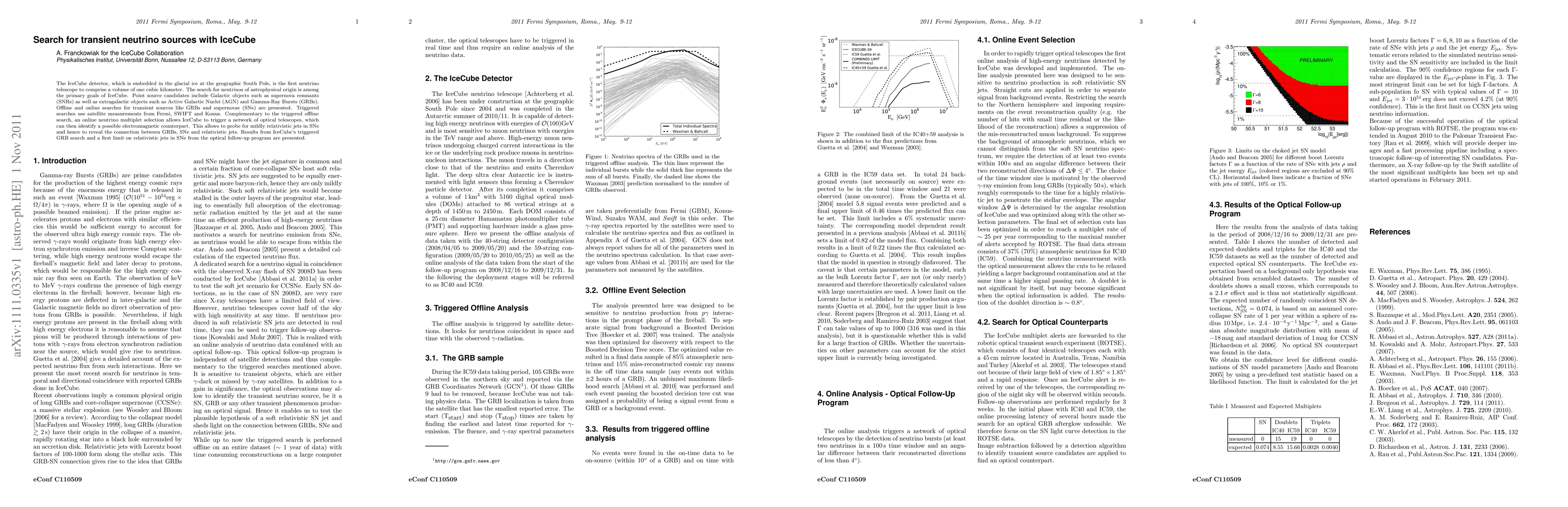 The IceCube detector searches for neutrinos from transient astrophysical sources like GRBs and supernovae, utilizing both triggered and offline methods. Results include findings from IceCube's GRB search and initial limits on relativistic jets in supernovae from optical follow-up observations.