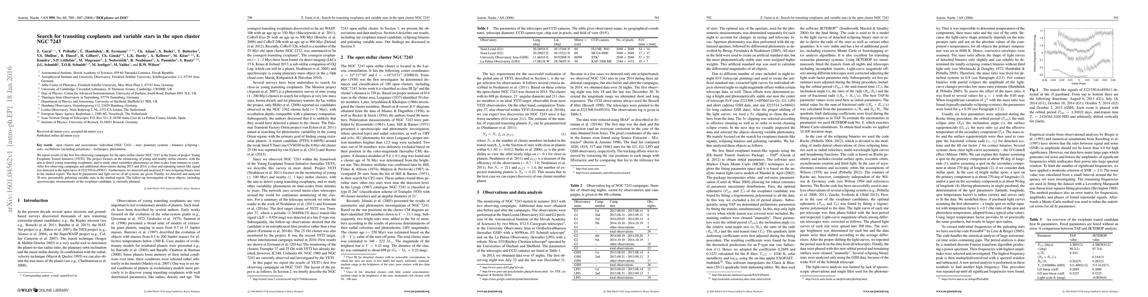 We report results of the first five observing campaigns for the open stellar cluster NGC 7243 in the frame of project Young Exoplanet Transit Initiative (YETI). The project focuses on the monitoring of young and nearby stellar clusters, with the aim to detect young transiting exoplanets, and to study other variability phenomena on time-scales from minutes to years. After five observing campaigns and additional observations during 2013 and 2014, a clear and repeating transit-like signal was detected in the light curve of J221550.6+495611. Furthermore, we detected and analysed 37 new eclipsing binary stars in the studied region. The best fit parameters and light curves of all systems are given. Finally, we detected and analysed 26 new, presumably pulsating variable stars in the studied region. The follow-up investigation of these objects, including spectroscopic measurements of the exoplanet candidate, is currently planned.