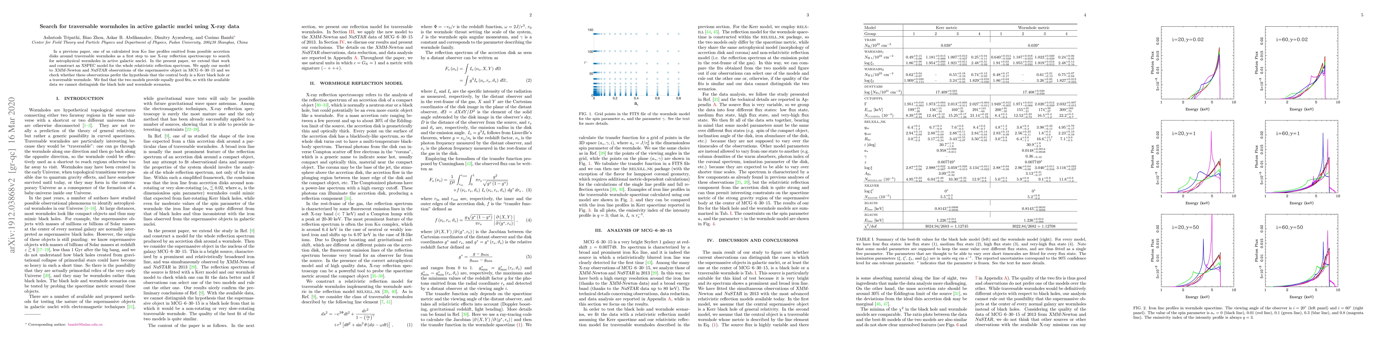 This paper develops an XSPEC model to analyze X-ray reflection spectra from active galactic nuclei, applying it to observations of MCG-6-30-15. It finds no significant difference between the fits of a Kerr black hole and a traversable wormhole, indicating current data cannot distinguish between the two.