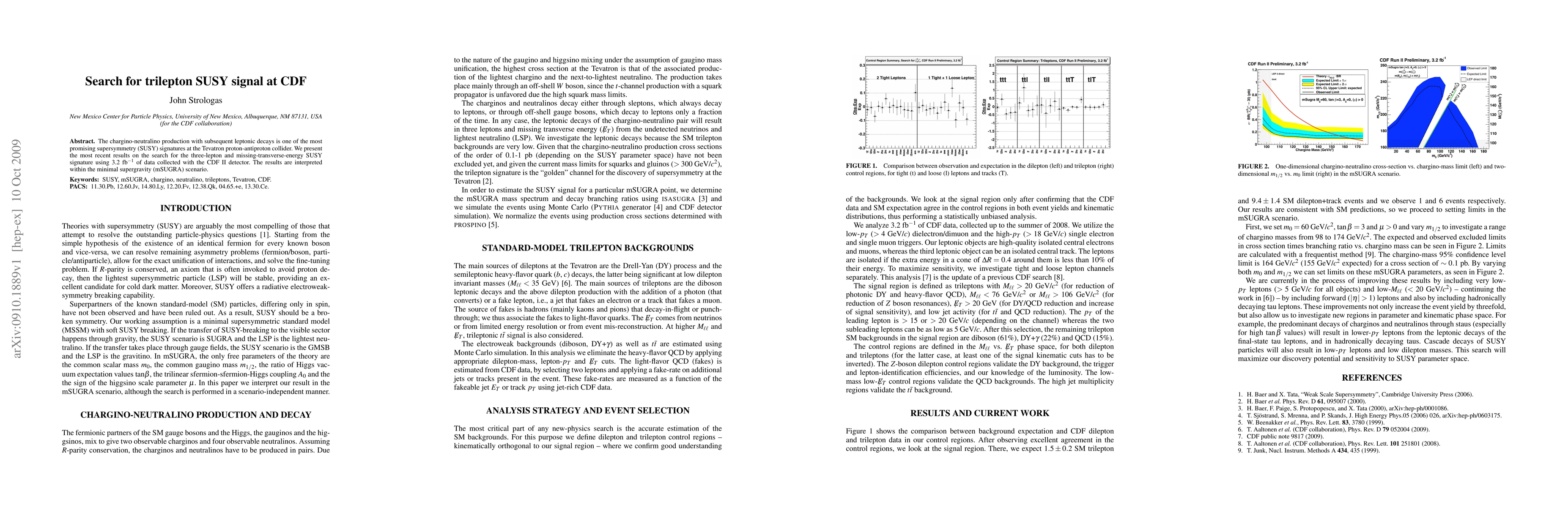 This paper reports on the search for supersymmetry (SUSY) signals at the Tevatron via chargino-neutralino production leading to three-lepton events and missing transverse energy, using 3.2 fb-1 of data from the CDF II detector, with results interpreted within the minimal supergravity framework. No significant deviations from the Standard Model were observed.