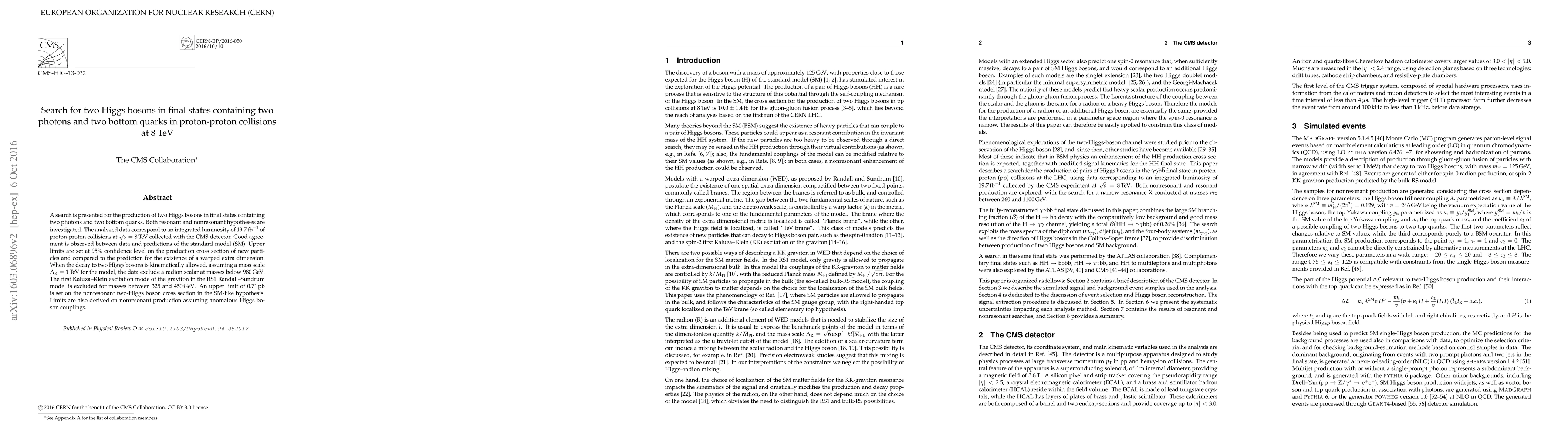This paper investigates the production of two Higgs bosons in proton-proton collisions at 8 TeV, focusing on final states with two photons and two bottom quarks. No new particles are observed, and upper limits are set on the production cross sections, excluding certain models of warped extra dimensions.