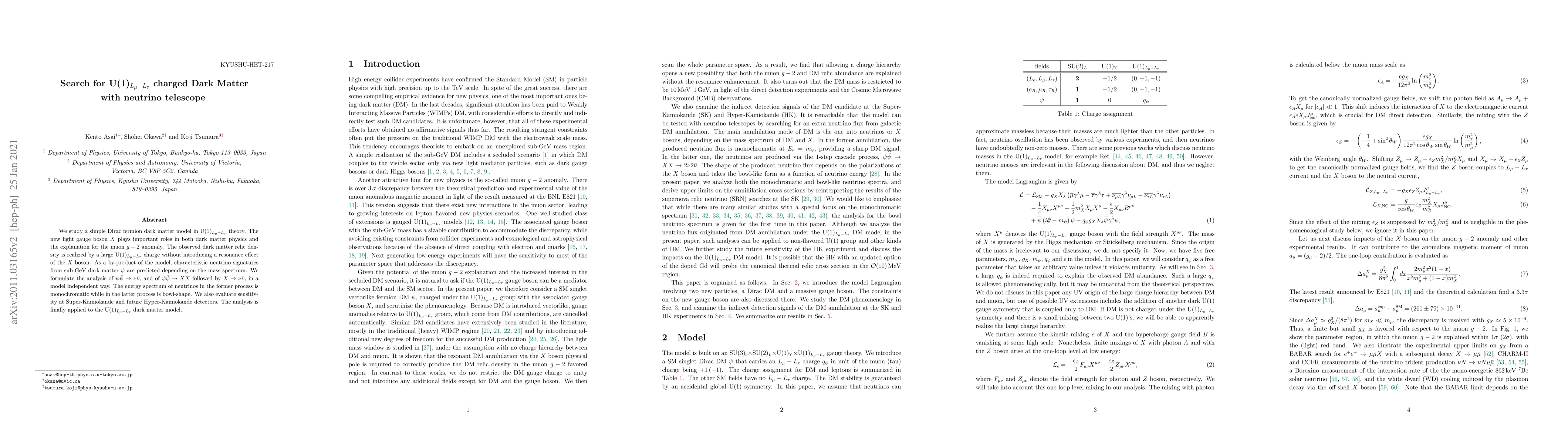 This paper explores a Dirac fermion dark matter model in U(1)$_{L_\mu-L_\tau}$ theory, where a new gauge boson $X$ explains the muon $g-2$ anomaly and dark matter relic density. It predicts distinct neutrino signatures from sub-GeV dark matter and evaluates detection potential at Super-Kamiokande and Hyper-Kamiokande.