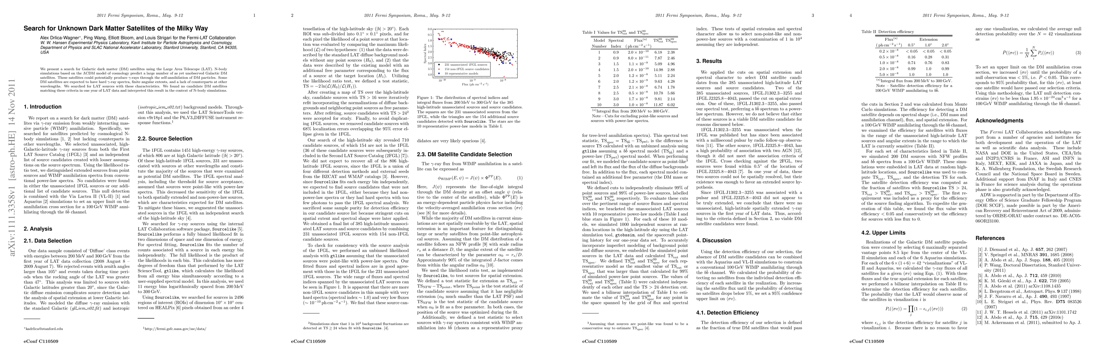 We present a search for Galactic dark matter (DM) satellites using the Large Area Telescope (LAT). N-body simulations based on the Lambda-CDM model of cosmology predict a large number of as yet unobserved Galactic DM satellites. These satellites could potentially produce gamma rays through the self-annihilation of DM particles. Some DM satellites are expected to have hard gamma-ray spectra, finite angular extents, and a lack of counterparts at other wavelengths. We searched for LAT sources with these characteristics. We found no candidate DM satellites matching these criteria in one year of LAT data and interpreted this result in the context of N-body simulations.