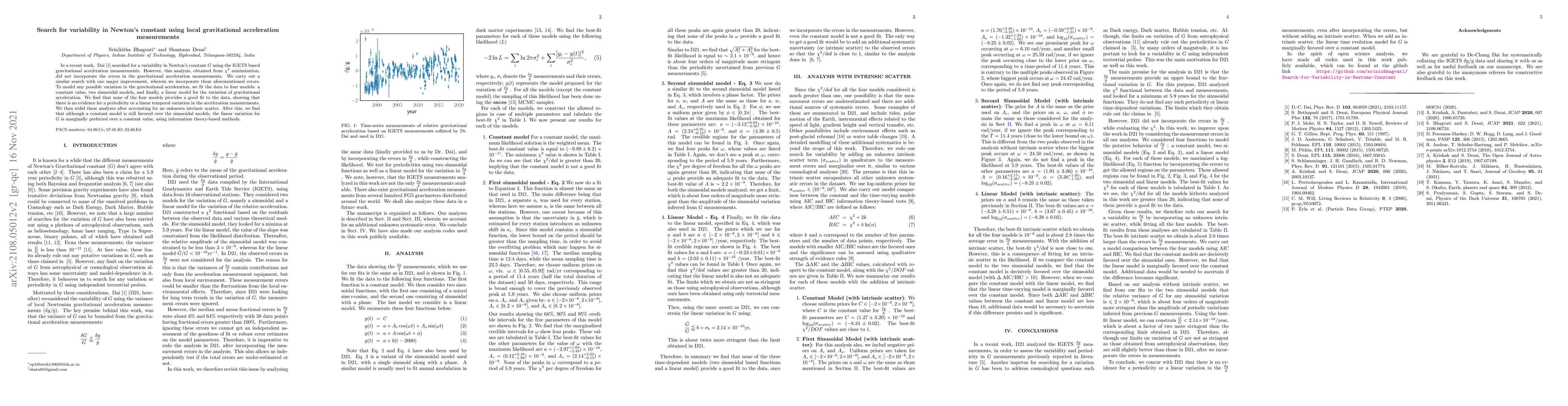 In a recent work, Dai (arXiv:2103.11157) searched for a variability in Newton's constant $G$ using the IGETS based gravitational acceleration measurements. However, this analysis, obtained from $\chi^2$ minimization, did not incorporate the errors in the gravitational acceleration measurements. We carry out a similar search with one major improvement, wherein we incorporate these aforementioned errors. To model any possible variation in the gravitational acceleration, we fit the data to four models: a constant value, two sinusoidal models, and finally, a linear model for the variation of gravitational acceleration. We find that none of the four models provides a good fit to the data, showing that there is no evidence for a periodicity or a linear temporal variation in the acceleration measurements. We then redid these analyses after accounting for an unknown intrinsic scatter. After this, we find that although a constant model is still favored over the sinusoidal models, the linear variation for $G$ is marginally preferred over a constant value, using information theory-based methods.