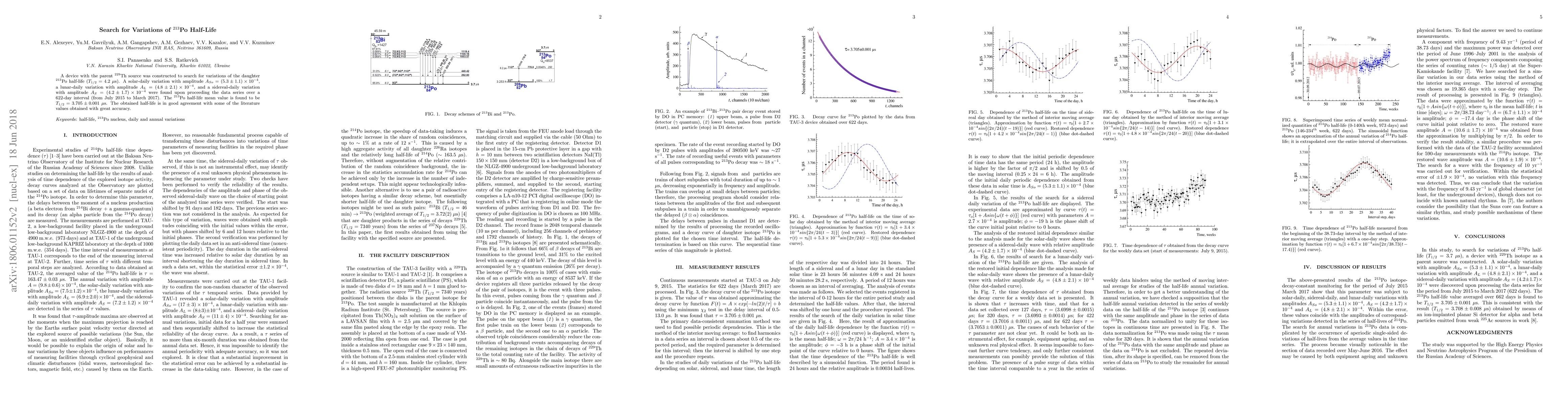 A device with the parent $^{229}$Th source was constructed to search for variations of the daughter $^{213}$Po half-life ($T_{1/2} = 4.2$ $\mu$s). A solar-daily variation with amplitude $A_{So}=(5.3 \pm 1.1) \times 10^{-4}$, a lunar-daily variation with amplitude $A_L = (4.8 \pm 2.1) \times 10^{-4}$, and a sidereal-daily variation with amplitude $A_S = (4.2 \pm 1.7) \times 10^{-4}$ were found upon proceeding the data series over a 622-day interval (from July 2015 to March 2017). The $^{213}$Po half-life mean value is found to be $T_{1/2} = 3.705 \pm 0.001$ $\mu$s. The obtained half-life is in good agreement with some of the literature values obtained with great accuracy.