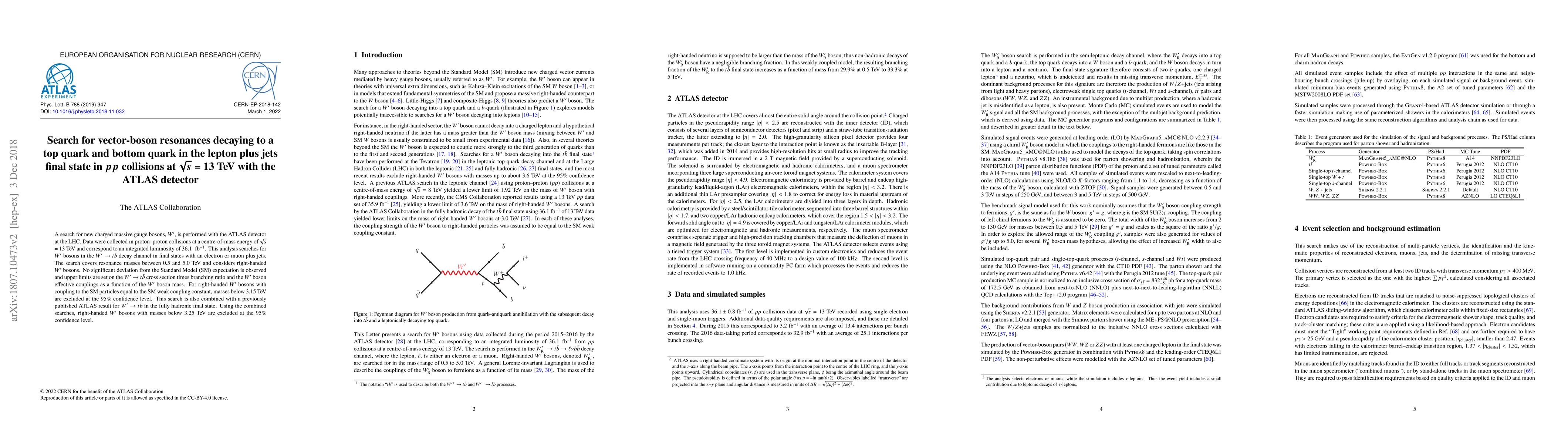 A search for new charged massive gauge bosons, $W^\prime$, is performed with the ATLAS detector at the LHC. Data were collected in proton-proton collisions at a centre-of-mass energy of $\sqrt{s}$ = 13 TeV and correspond to an integrated luminosity of 36.1 $\textrm{fb}^{-1}$. This analysis searches for $W^\prime$ bosons in the $W^\prime \rightarrow t\bar{b}$ decay channel in final states with an electron or muon plus jets. The search covers resonance masses between 0.5 and 5.0 TeV and considers right-handed $W^\prime$ bosons. No significant deviation from the Standard Model (SM) expectation is observed and upper limits are set on the $W^\prime \rightarrow t\bar{b}$ cross section times branching ratio and the $W^\prime$ boson effective couplings as a function of the $W^\prime$ boson mass. For right-handed $W^\prime$ bosons with coupling to the SM particles equal to the SM weak coupling constant, masses below 3.15 TeV are excluded at the 95% confidence level. This search is also combined with a previously published ATLAS result for $W^\prime \rightarrow t\bar{b}$ in the fully hadronic final state. Using the combined searches, right-handed $W^\prime$ bosons with masses below 3.25 TeV are excluded at the 95% confidence level.
