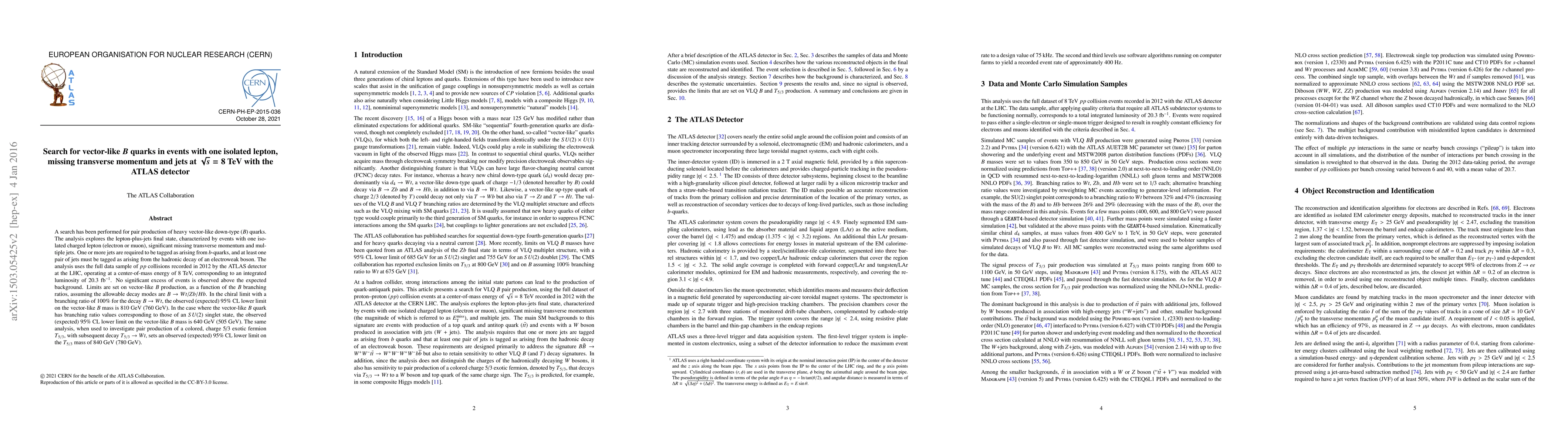 The ATLAS experiment at the LHC searched for pair production of vector-like down-type $B$ quarks in events with one isolated lepton, missing transverse momentum, and jets at 8 TeV. No significant excess was observed, setting lower limits on the $B$ quark mass at 810 GeV and 640 GeV under different decay assumptions.