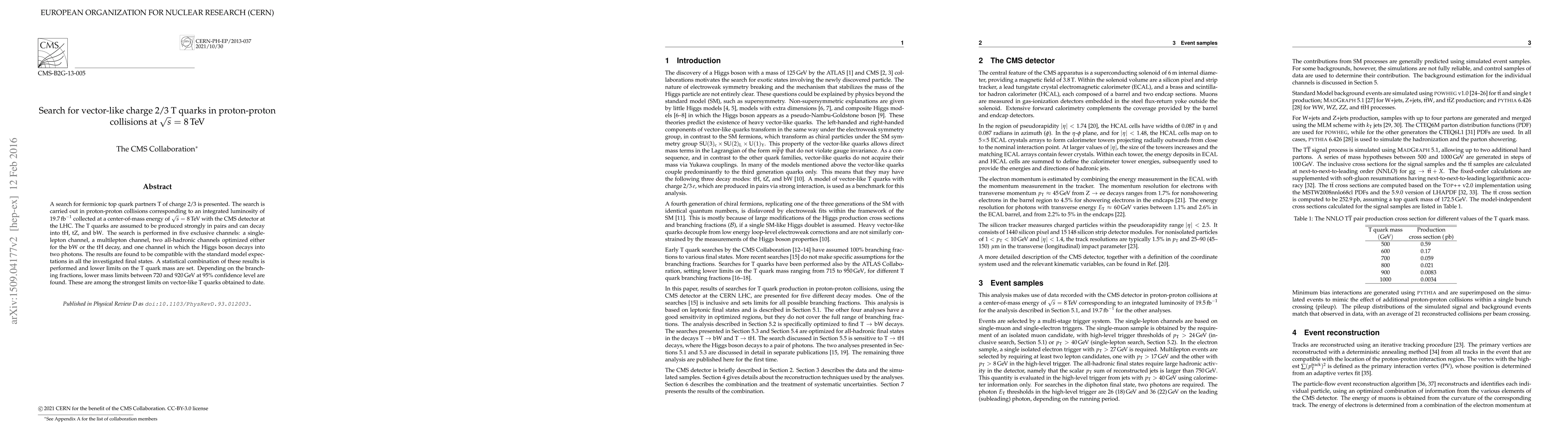 This paper reports a search for vector-like T quarks of charge 2/3 in proton-proton collisions at 8 TeV with the CMS detector. No evidence of T quarks is found, leading to lower mass limits between 720 and 920 GeV at 95% confidence level, among the strongest constraints to date.