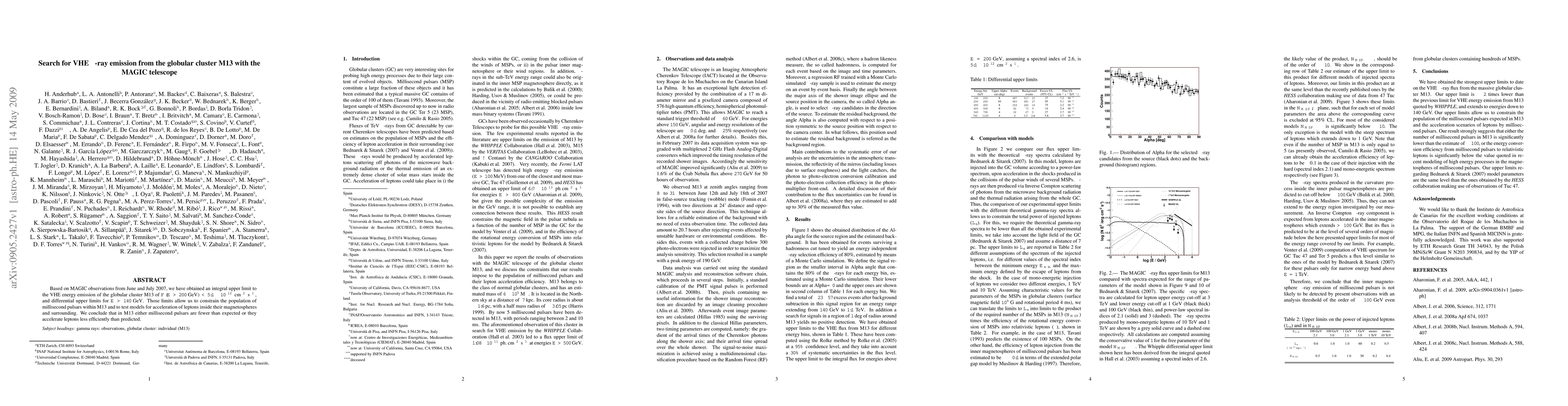 The MAGIC telescope observed M13 in 2007, setting upper limits on VHE $\gamma$-ray emission, suggesting fewer or less efficient millisecond pulsars than predicted. These findings constrain models of lepton acceleration in their magnetospheres.