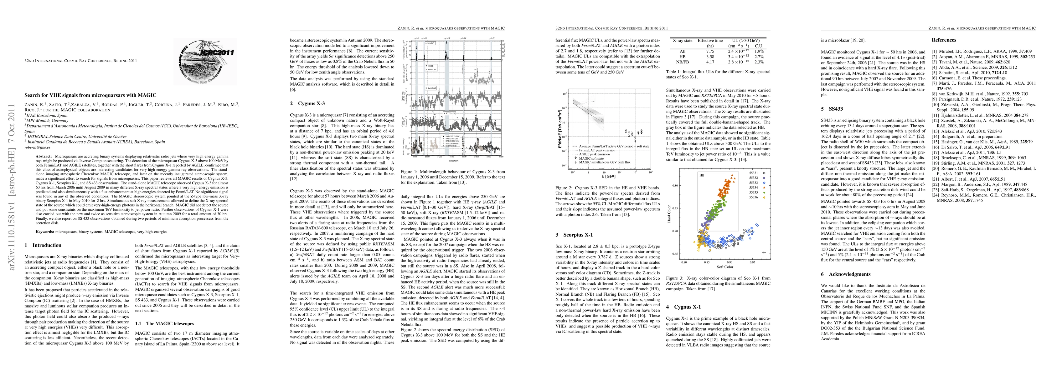 Microquasars are accreting binary systems displaying relativistic radio jets where very high energy gamma rays might be produced via Inverse Compton scattering. The detection of the microquasar Cygnus X-3 above 100 MeV by both Fermi/LAT and AGILE satellites, together with the short flares from Cygnus X-1 reported by AGILE, confirmed that this class of astrophysical objects are interesting candidates for very high energy gamma-ray observations. The stand-alone imaging atmospheric Cherenkov MAGIC telescope, and later on the recently inaugurated stereoscopic system, made a significant effort to search for signals from microquasars. This paper reviews all MAGIC results of Cygnus X-3, Cygnus X-1, Scorpius X-1, and SS 433 observations. The stand-alone MAGIC telescope observed Cygnus X-3 for almost 60 hrs from March 2006 until August 2009 in many different X-ray spectral states where a very high energy emission is predicted and also simultaneously with a flux enhancement at high energies detected by Fermi/LAT. No significant signal was found in any of the observed conditions. The MAGIC stereoscopic system pointed at the Z-type low-mass X-ray binary Scorpius X-1 in May 2010 for ~8 hrs. Simultaneous soft X-ray measurements allowed to define the X-ray spectral state of the source which could emit very-high-energy photons in the horizontal branch. MAGIC did not detect the source and put some constraints on the maximum TeV luminosity to jet power ratio. Further observations of Cygnus X-1 were also carried out with the new and twice as sensitive stereoscopic system in Autumn 2009 for a total amount of 30 hrs. Finally, we also report on SS 433 observations obtained during two periods of minimum absorption processes from the accretion disk.