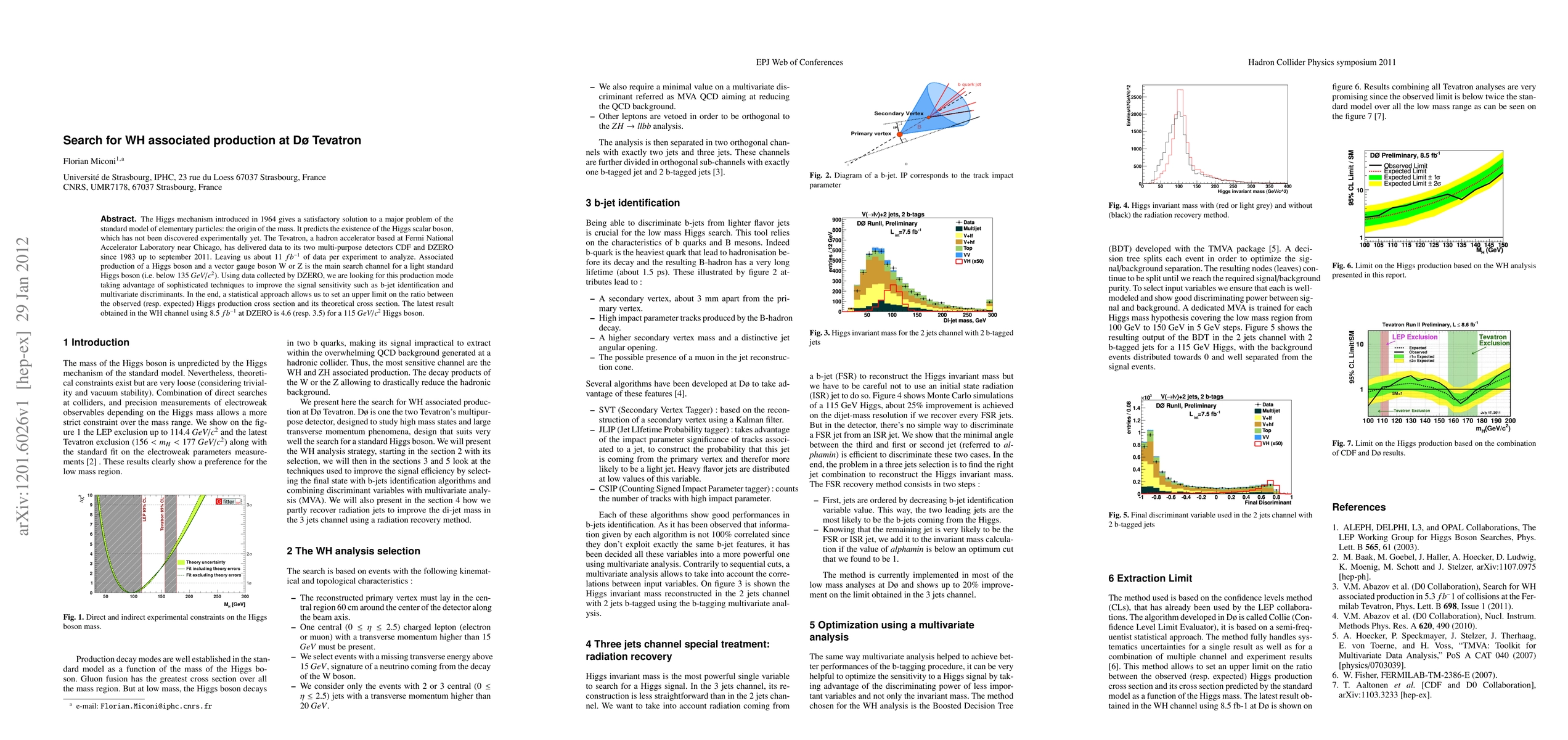 The Higgs mechanism introduced in 1964 gives a satisfactory solution to a major problem of the standard model of elementary particles: the origin of the mass. It predicts the existence of the Higgs scalar boson, which has not been discovered experimentally yet. The Tevatron, a hadron accelerator based at Fermi National Accelerator Laboratory near Chicago, has delivered data to its two multi-purpose detectors CDF and DZERO since 1983 up to september 2011. Leaving us about 11 fb-1 of data per experiment to analyze. Associated production of a Higgs boson and a vector gauge boson W or Z is the main search channel for a light standard Higgs boson (i.e. below 135 GeV/c2). Using data collected by DZERO, we are looking for this production mode taking advantage of sophisticated techniques to improve the signal sensitivity such as b-jet identification and multivariate discriminants. In the end, a statistical approach allows us to set an upper limit on the ratio between the observed (resp. expected) Higgs production cross section and its theoretical cross section. The latest result obtained in the WH channel using 8.5 f b-1 at DZERO is 4.6 (resp. 3.5) for a 115 GeV/c2 Higgs boson.