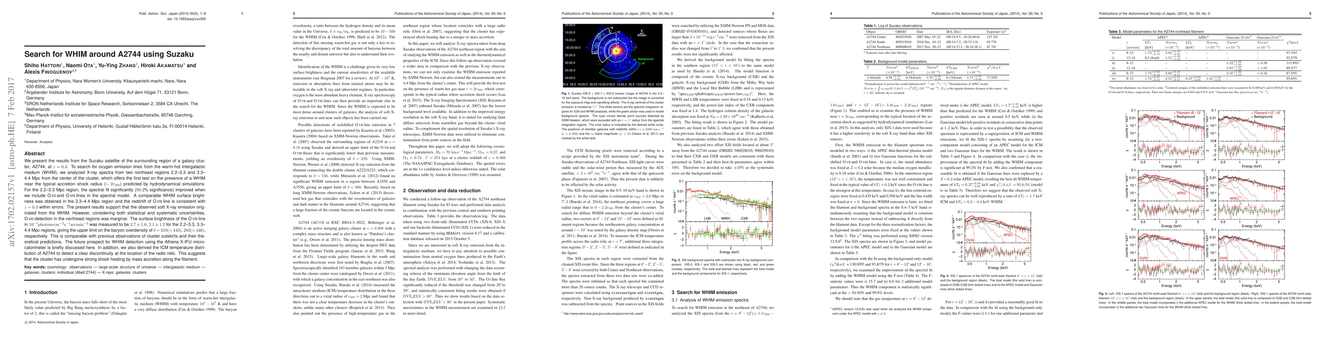 We present the results from the Suzaku satellite of the surrounding region of a galaxy cluster, A2744, at $z=0.3$. To search for oxygen emission lines from the warm-hot intergalactic medium (WHIM), we analyzed X-ray spectra from two northeast regions 2.2-3.3 and 3.3-4.4 Mpc from the center of the cluster, which offers the first test on the presence of a WHIM near the typical accretion shock radius ($\sim 2r_{200}$) predicted by hydrodynamical simulations. For the 2.2-3.3 Mpc region, the spectral fit significantly (99.2% significance) improved when we include OVII and OVIII lines in the spectral model. A comparable WHIM surface brightness was obtained in the 3.3-4.4 Mpc region and the redshift of OVIII line is consistent with $z=0.3$ within errors. The present results support that the observed soft X-ray emission originated from the WHIM. However, considering both statistical and systematic uncertainties, OVIII detection in the northeast regions was marginal. The surface brightness of the OVIII line in ${\rm 10^{-7} photons\,cm^{-2}s^{-1}arcmin^{-2}}$ was measured to be $2.7\pm 1.0$, $2.1 \pm 1.2$ for the 2.2-3.3, 3.3-4.4 Mpc regions, giving the upper limit on the baryon overdensity of $\delta = 319 (<443)$, $283 (<446)$, respectively. This is comparable with previous observations of cluster outskirts and their theoretical predictions. The future prospect for WHIM detection using the Athena X-IFU micro-calorimeter is briefly discussed here. In addition, we also derived the ICM temperature distribution of A2744 to detect a clear discontinuity at the location of the radio relic. This suggests that the cluster has undergone strong shock heating by mass accretion along the filament.