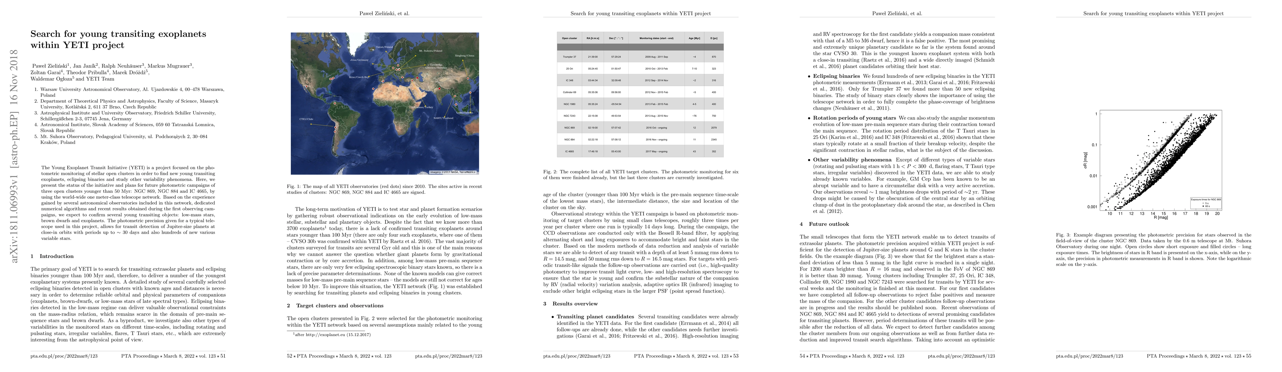 The YETI project aims to discover young transiting exoplanets through photometric monitoring of open clusters. Initial campaigns on clusters NGC 869, NGC 884, and IC 4665, using a global network of one-meter telescopes, are expected to confirm several transiting objects, including low-mass stars, brown dwarfs, and exoplanets.