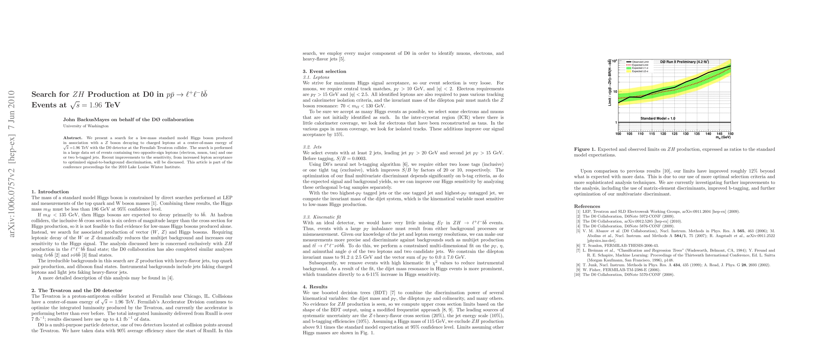 We present a search for a low-mass standard model Higgs boson produced in association with a $Z$ boson decaying to charged leptons at a center-of-mass energy of $\sqrt{s}=$1.96 TeV with the D0 detector at the Fermilab Tevatron collider. The search is performed in a large data set of events containing two opposite-sign leptons (electron, muon, tau) and one or two b-tagged jets. Recent improvements to the sensitivity, from increased lepton acceptance to optimized signal-to-background discrimination, will be discussed.