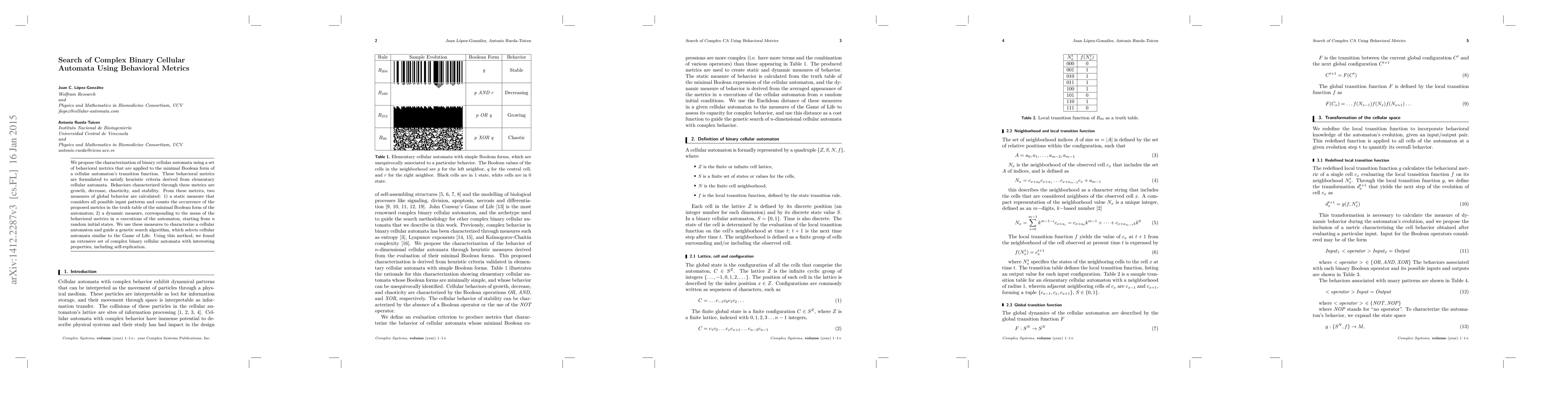 The novelty of this work lies in the use of heuristic criteria from elementary cellular automata to define behavioral metrics and the application of a genetic search algorithm to discover complex binary cellular automata with interesting properties like self-replication.