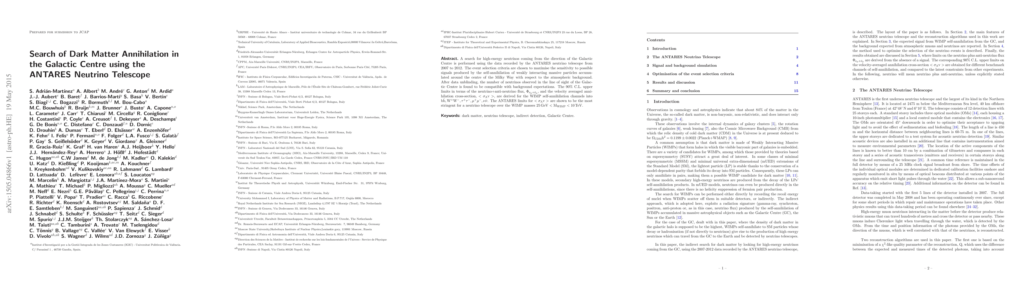 This paper reports a search for high-energy neutrinos from the Galactic Centre using the ANTARES telescope, finding no significant excess over background. The study sets stringent limits on the self-annihilation cross-section of weakly interacting massive particles (WIMPs) across various mass ranges.