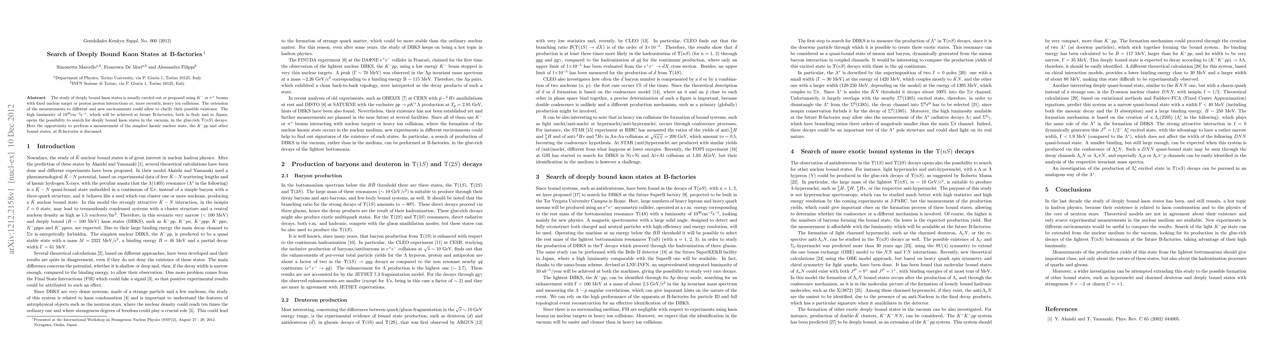 This paper explores the potential to search for deeply bound kaon states using the high luminosity environment of future B-factories in Italy and Japan, focusing on kaonic nuclear states like $K^-pp$ in the vacuum and $\Upsilon(nS)$ decays. The study aims to clarify the existence of these states through new experimental environments.