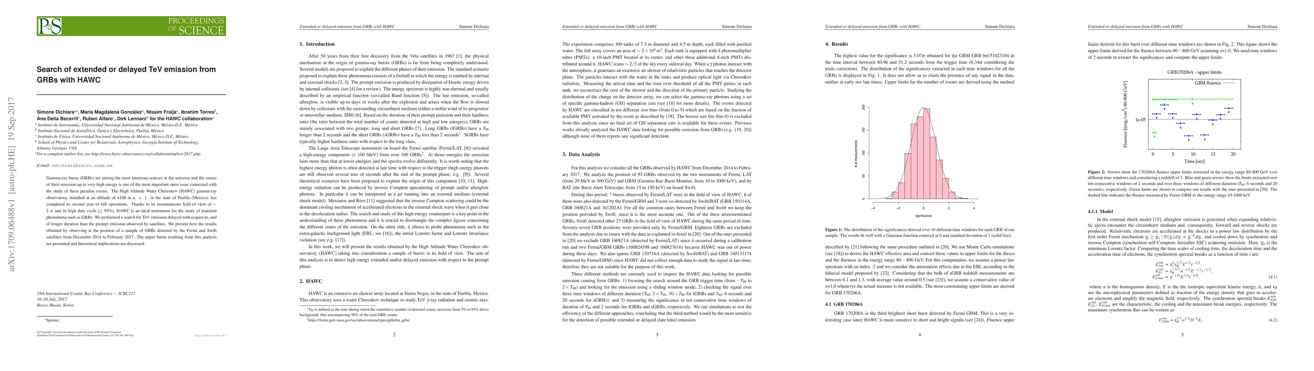 Researchers used HAWC to search for delayed or longer-lasting TeV emission from Gamma-Ray Bursts (GRBs), finding upper limits on this phenomenon. The study aims to better understand the nature of GRB emission up to very high energies.