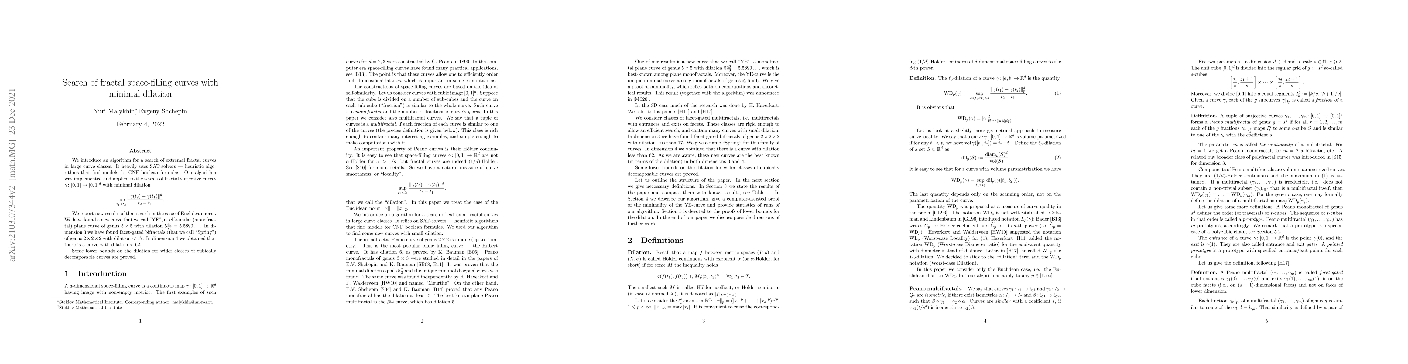 This paper presents an algorithm utilizing SAT-solvers to search for fractal space-filling curves with minimal dilation. It reports new findings, including a self-similar plane curve "YE" with genus $5\times 5$ and a dilation of $5.5890\ldots$, and facet-gated bifractals "Spring" in dimension 3 with dilation $<17$.
