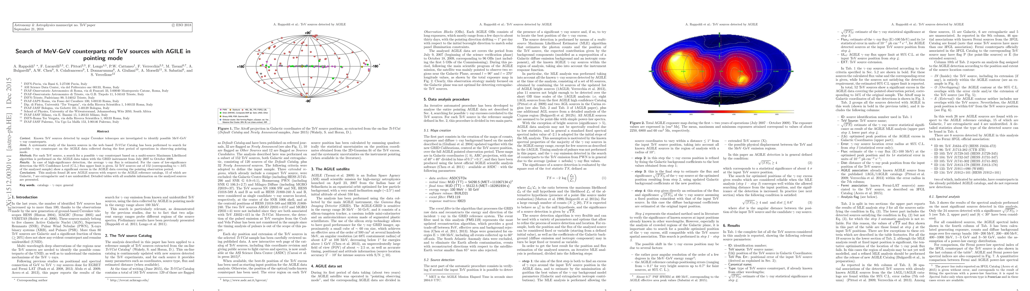 Context. Known TeV sources detected by major Cerenkov telescopes are investigated to identify possible MeV-GeV gamma-ray counterparts. Aims. A systematic study of the known sources in the web-based TeVCat Catalog has been performed to search for possible gamma-ray counterpart on the AGILE data collected during the first period of operations in observing pointing mode. Methods. For each TeV source, a search for a possible gamma-ray counterpart based on a multi-source Maximum Likelihood algorithm is performed on the AGILE data taken with the GRID instrument from July 2007 to October 2009. Results. In case of high-significance detection, the average gamma-ray flux is estimated. For the cases of low-significance detection the 95 % Confidence Level (C.L.) flux upper limit is given. 52 TeV sources out of 152 (corresponding to ~34 % of the analysed sample) show a significant excess in the AGILE data covering the pointing observation period. Conclusions. This analysis found 26 new AGILE sources with respect to the AGILE reference catalogs, 15 of which are Galactic, 7 are extragalactic and 4 are unidentified. Detailed tables with all available information on the analysed sources are presented.