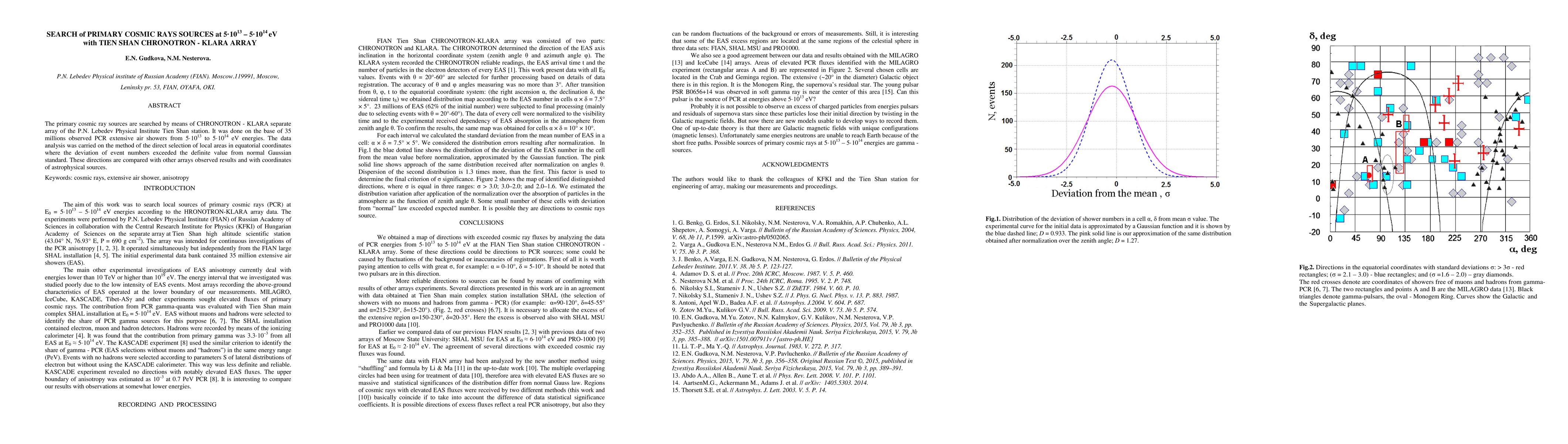 The primary cosmic ray sources are searched by means of CHRONOTRON - KLARA separate array of the P.N. Lebedev Physical Institute Tien Shan station. It was done on the base of 35 millions observed PCR extensive air showers from 5x10**13 to 5x10**14 eV energies. The data analysis was carried on the method of the direct selection of local areas in equatorial coordinates where the deviation of event numbers exceeded the definite value from normal Gaussian standard. These directions are compared with other arrays observed results and with coordinates of astrophysical sources.