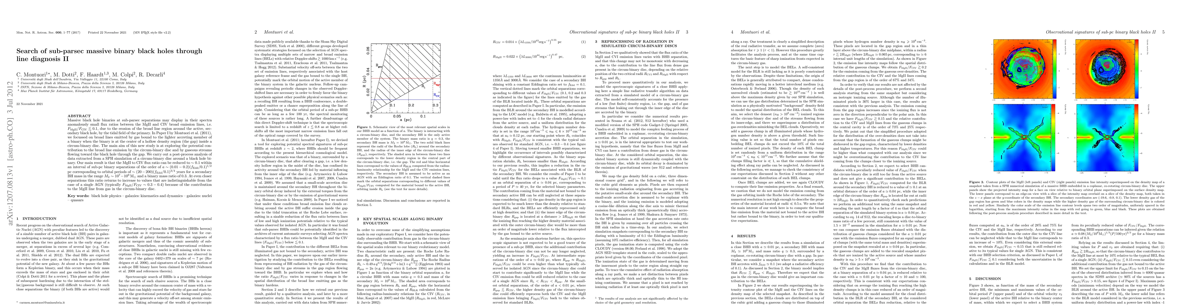 Massive black hole binaries at sub-parsec separations may display in their spectra anomalously small flux ratios between the MgII and CIV broad emission lines, i.e. F_MgII/F_CIV <~ 0.1, due to the erosion of the broad line region around the active, secondary black hole, by the tidal field of the primary. In Paper I by Montuori et al. (2011), we focussed on broad lines emitted by gas bound to the lighter accreting member of a binary when the binary is at the center of a hollow density region (the gap) inside a circum-binary disc. The main aim of this new study is at exploring the potential contribution to the broad line emission by the circum-binary disc and by gaseous streams flowing toward the black hole through the gap. We carry out a post-process analysis of data extracted from a SPH simulation of a circum-binary disc around a black hole binary. Our main result is that the MgII to CIV flux ratio can be reduced to ~ 0.1 within an interval of sub-pc binary separations of the order of a ~ (0.01-0.2)(f_Edd/0.1)^(1/2) pc corresponding to orbital periods of ~ (20-200) (f_Edd/0.1)^(3/4) years for a secondary BH mass in the range M_2 ~ 10^7-10^9 M_sun and a binary mass ratio of 0.3. At even closer separations this ratio returns to increase to values that are indistinguishable from the case of a single AGN (typically F_MgII/F_CIV ~ 0.3-0.4) because of the contribution to the MgII line from gas in the circum-binary disc.