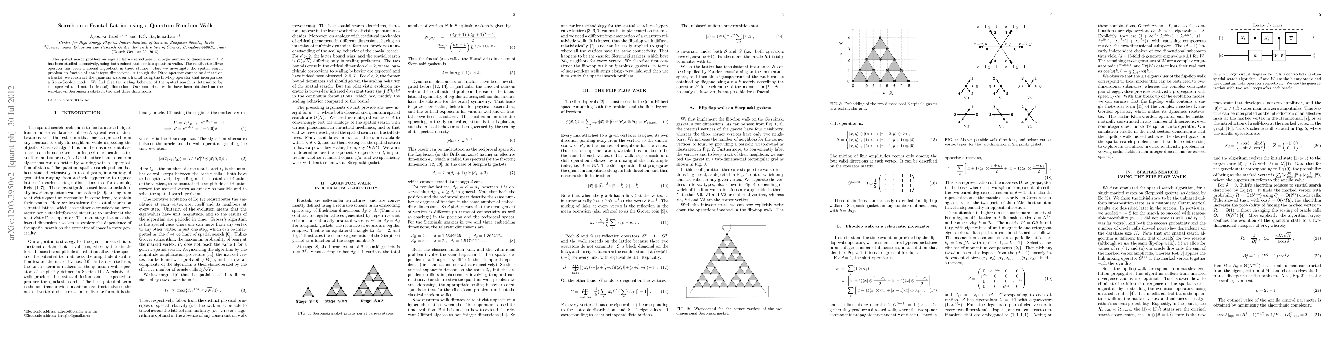 The spatial search problem on regular lattice structures in integer number of dimensions $d\geq2$ has been studied extensively, using both coined and coinless quantum walks. The relativistic Dirac operator has been a crucial ingredient in these studies. Here we investigate the spatial search problem on fractals of non-integer dimensions. Although the Dirac operator cannot be defined on a fractal, we construct the quantum walk on a fractal using the flip-flop operator that incorporates a Klein-Gordon mode. We find that the scaling behavior of the spatial search is determined by the spectral (and not the fractal) dimension. Our numerical results have been obtained on the well-known Sierpinski gaskets in two and three dimensions.