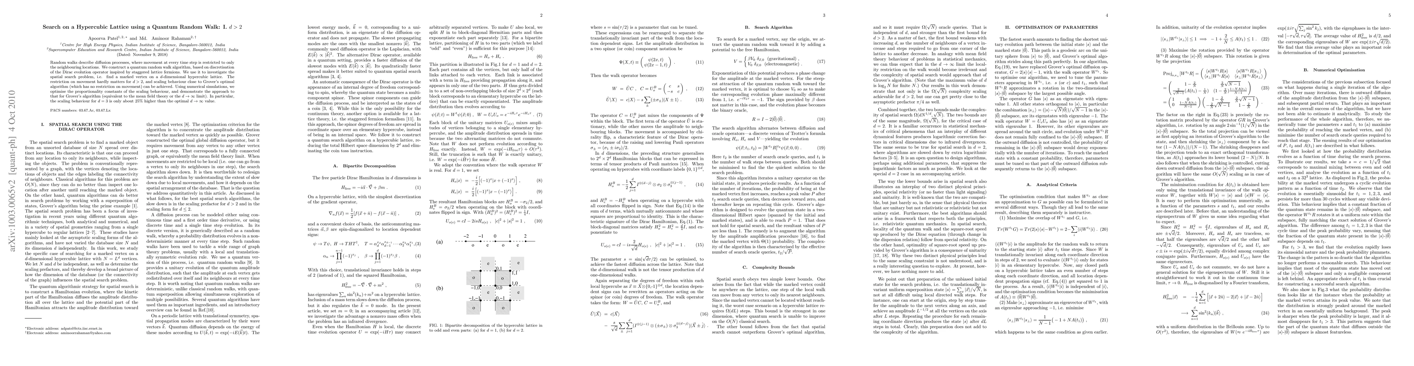 This paper proposes a quantum random walk algorithm on a hypercubic lattice to solve the spatial search problem, achieving near-optimal scaling behavior for dimensions $d>2$ comparable to Grover's algorithm, with numerical simulations showing particularly efficient performance for $d=3$.