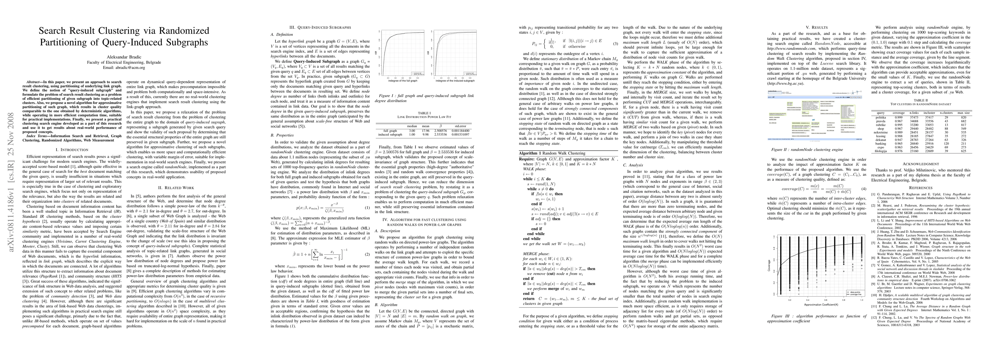 This paper introduces a randomized algorithm for clustering search results by partitioning query-induced subgraphs of link graphs, achieving comparable cluster quality to deterministic methods but with significantly faster computation time. The effectiveness of the proposed approach is demonstrated through a practical clustering search engine.