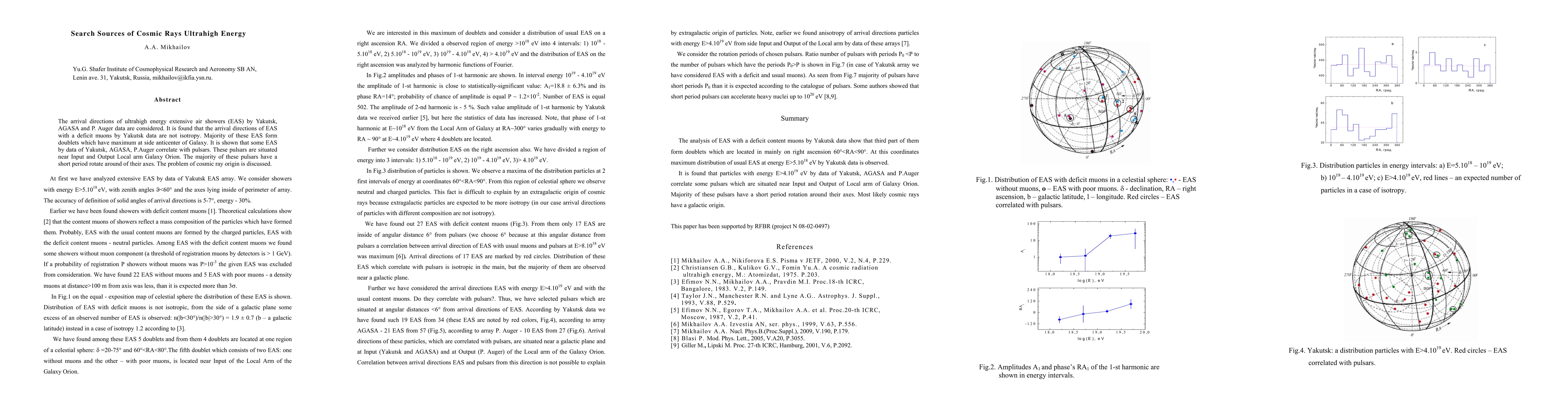 The arrival directions of ultrahigh energy extensive air showers (EAS) by Yakutsk, AGASA and P. Auger data are considered. It is found that the arrival directions of EAS with a deficit muons by Yakutsk data are not isotropy. Majority of these EAS form doublets which have maximum at side anticenter of Galaxy. It is shown that some EAS by data of Yakutsk, AGASA, P.Auger correlate with pulsars. These pulsars are situated near Input and Output Local arm Galaxy Orion. The majority of these pulsars have a short period rotate around of their axes. The problem of cosmic ray origin is discussed.