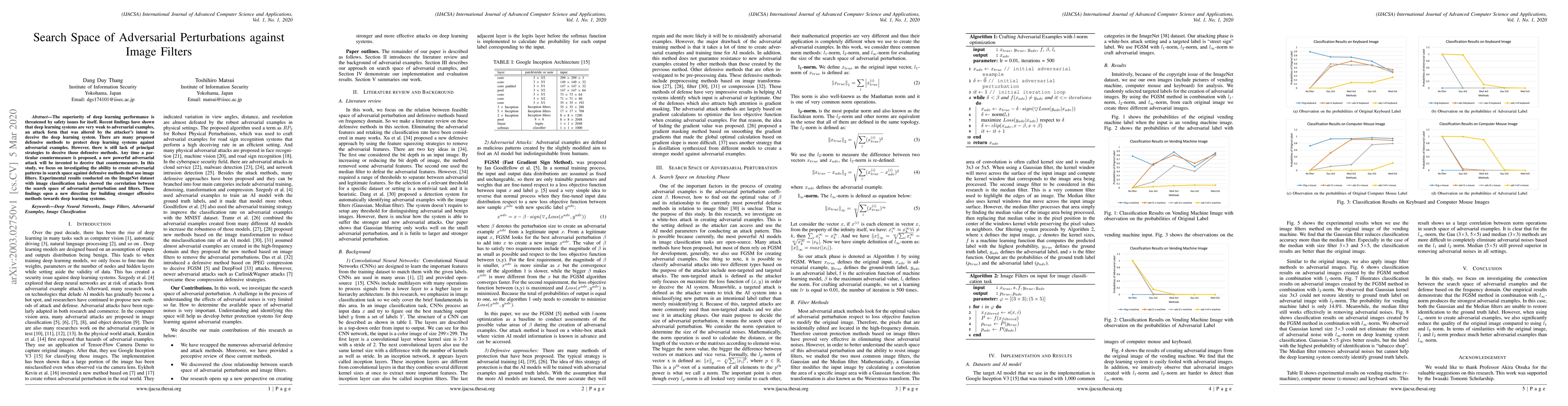 The superiority of deep learning performance is threatened by safety issues for itself. Recent findings have shown that deep learning systems are very weak to adversarial examples, an attack form that was altered by the attacker's intent to deceive the deep learning system. There are many proposed defensive methods to protect deep learning systems against adversarial examples. However, there is still a lack of principal strategies to deceive those defensive methods. Any time a particular countermeasure is proposed, a new powerful adversarial attack will be invented to deceive that countermeasure. In this study, we focus on investigating the ability to create adversarial patterns in search space against defensive methods that use image filters. Experimental results conducted on the ImageNet dataset with image classification tasks showed the correlation between the search space of adversarial perturbation and filters. These findings open a new direction for building stronger offensive methods towards deep learning systems.