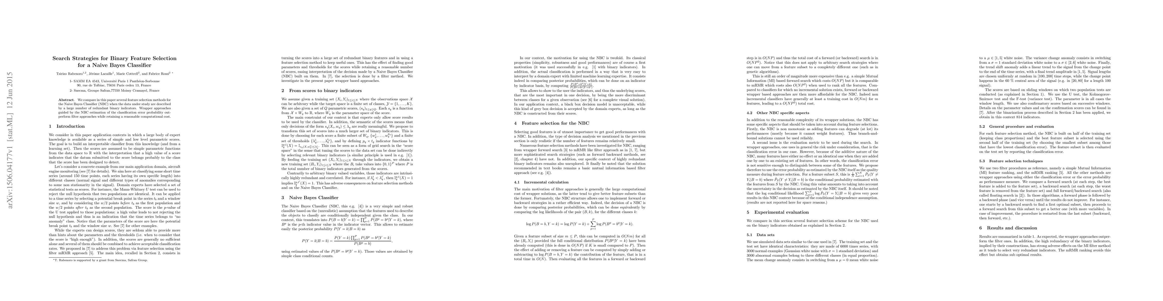 Summary: This paper evaluates various feature selection strategies for the Naive Bayes Classifier with binary data, finding that wrapper methods outperform filter methods, balancing performance with computational efficiency.