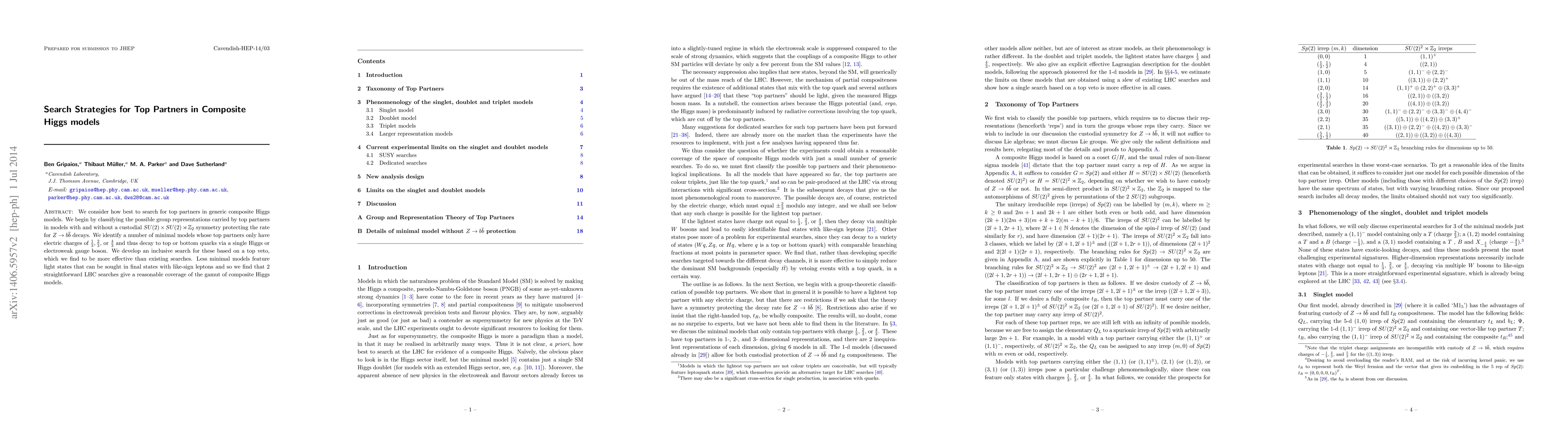 We consider how best to search for top partners in generic composite Higgs models. We begin by classifying the possible group representations carried by top partners in models with and without a custodial $SU(2)\times SU(2) \rtimes \mathbb{Z}_2$ symmetry protecting the rate for $Z \rightarrow b\overline{b}$ decays. We identify a number of minimal models whose top partners only have electric charges of $\frac{1}{3}, \frac{2}{3},$ or $\frac{4}{3}$ and thus decay to top or bottom quarks via a single Higgs or electroweak gauge boson. We develop an inclusive search for these based on a top veto, which we find to be more effective than existing searches. Less minimal models feature light states that can be sought in final states with like-sign leptons and so we find that 2 straightforward LHC searches give a reasonable coverage of the gamut of composite Higgs models.