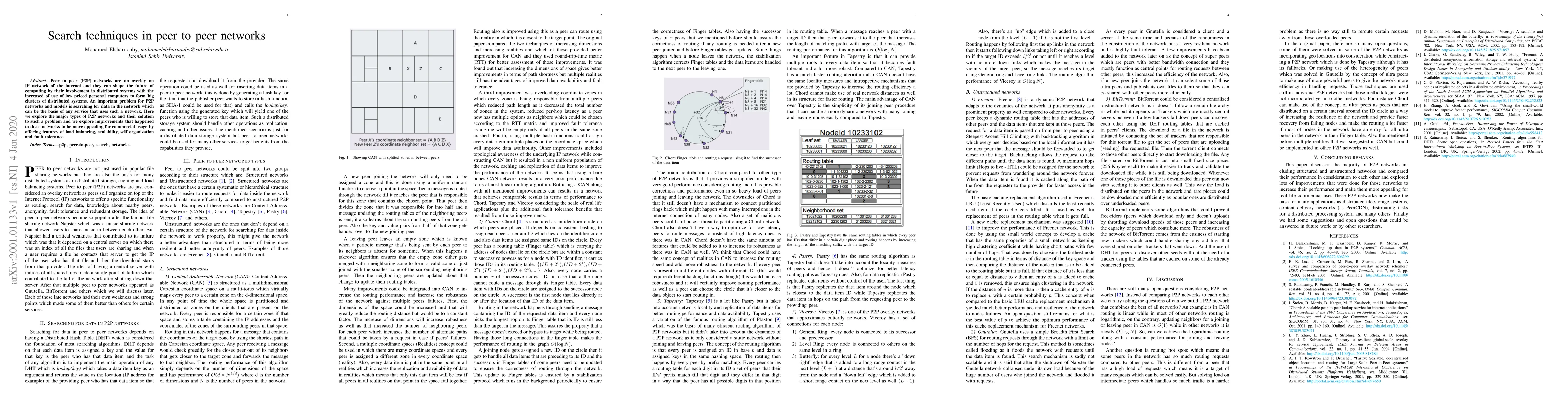 This paper examines the search techniques in peer-to-peer (P2P) networks, focusing on their types and solutions for data retrieval. It also discusses enhancements like load balancing and fault tolerance that improve P2P networks for commercial applications.