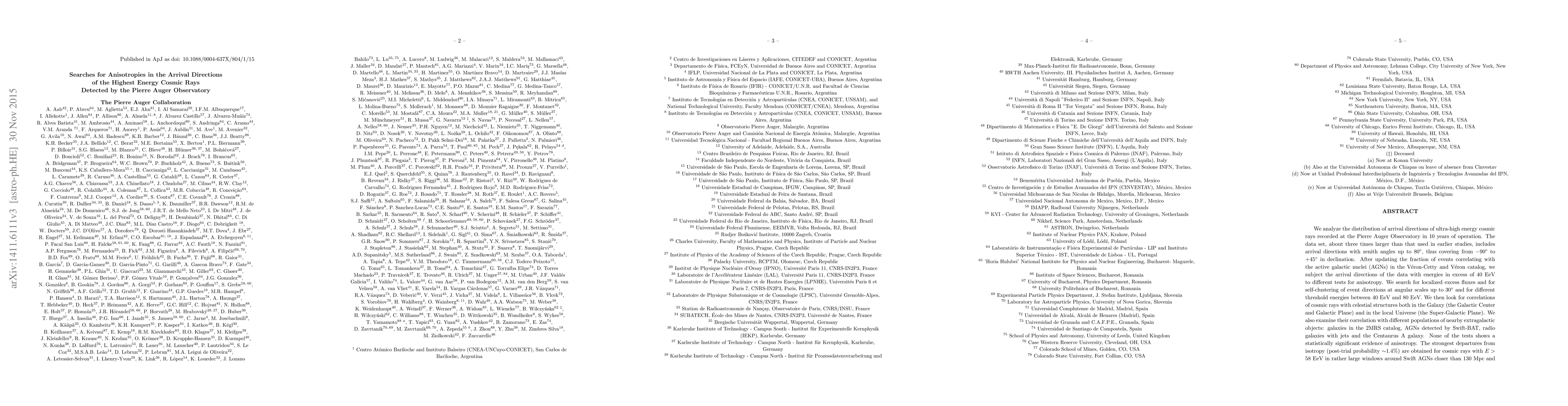 The Pierre Auger Observatory's 10-year data set of ultra-high energy cosmic rays shows no statistically significant anisotropy in arrival directions, despite testing various celestial structures and extragalactic objects for correlations. The strongest non-isotropic trend is observed for cosmic rays above 58 EeV near specific Swift AGNs and Centaurus~A.