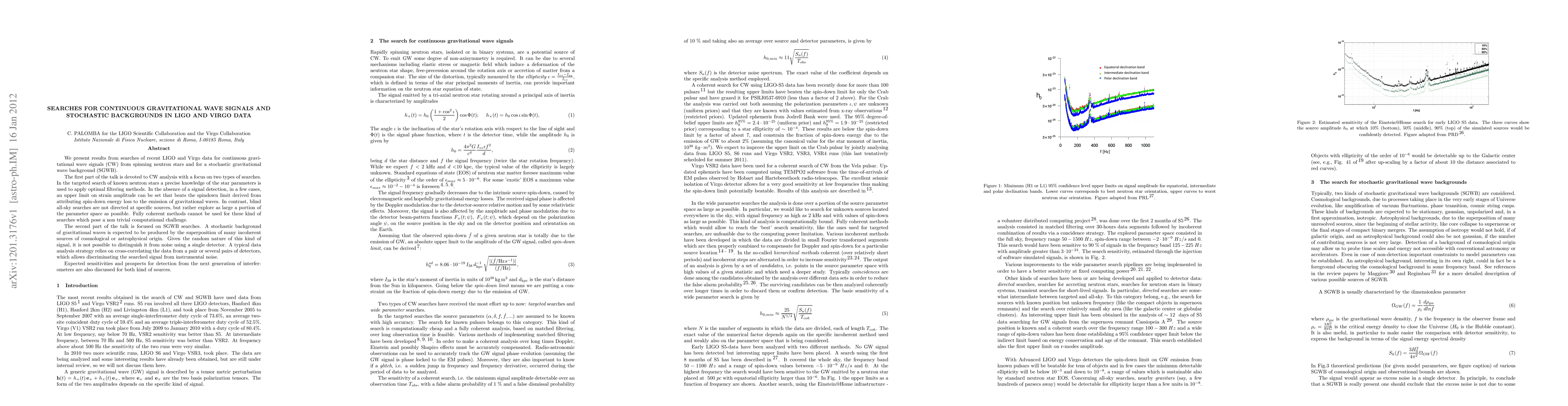 This paper reports on searches for continuous gravitational wave signals from spinning neutron stars and stochastic gravitational wave backgrounds using LIGO and Virgo data. Targeted searches for known neutron stars use optimal filtering, while blind all-sky searches cover broad parameter spaces. Stochastic background searches rely on cross-correlating multiple detectors to distinguish signals from noise. No detections were made, but upper limits on strain amplitude were set, surpassing spindown limits in some cases.
