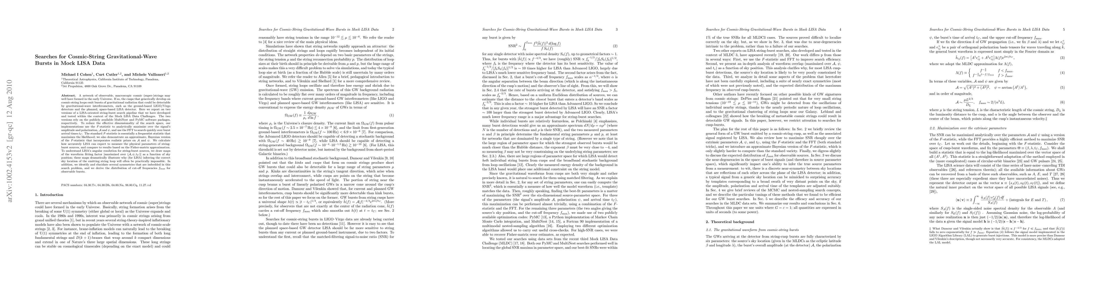 A network of observable, macroscopic cosmic (super-)strings may have formed in the early universe. If so, the cusps that generically develop on cosmic-string loops emit bursts of gravitational radiation that could be detectable by both ground- and space-based gravitational-wave interferometers. Here we report on two versions of a LISA-oriented string-burst search pipeline that we have developed and tested within the context of the Mock LISA Data Challenges. The two versions rely on the publicly available MultiNest and PyMC software packages, respectively. To reduce the effective dimensionality of the search space, our implementations use the F-statistic to analytically maximize over the signal's amplitude and polarization, A and psi, and use the FFT to search quickly over burst arrival times t_C. The standard F-statistic is essentially a frequentist statistic that maximizes the likelihood; we also demonstrate an approximate, Bayesian version of the F-statistic that incorporates realistic priors on A and psi. We calculate how accurately LISA can expect to measure the physical parameters of string-burst sources. To understand LISA's angular resolution for string-burst sources, we draw maps of the waveform fitting factor [maximized over (A psi, t_C)] as a function of sky position; these maps dramatically illustrate why (for LISA) inferring the correct sky location of the emitting string loop will often be practically impossible. We also identify and elucidate several symmetries that are imbedded in this search problem, and we derive the distribution of cut-off frequencies f_max for observable bursts.