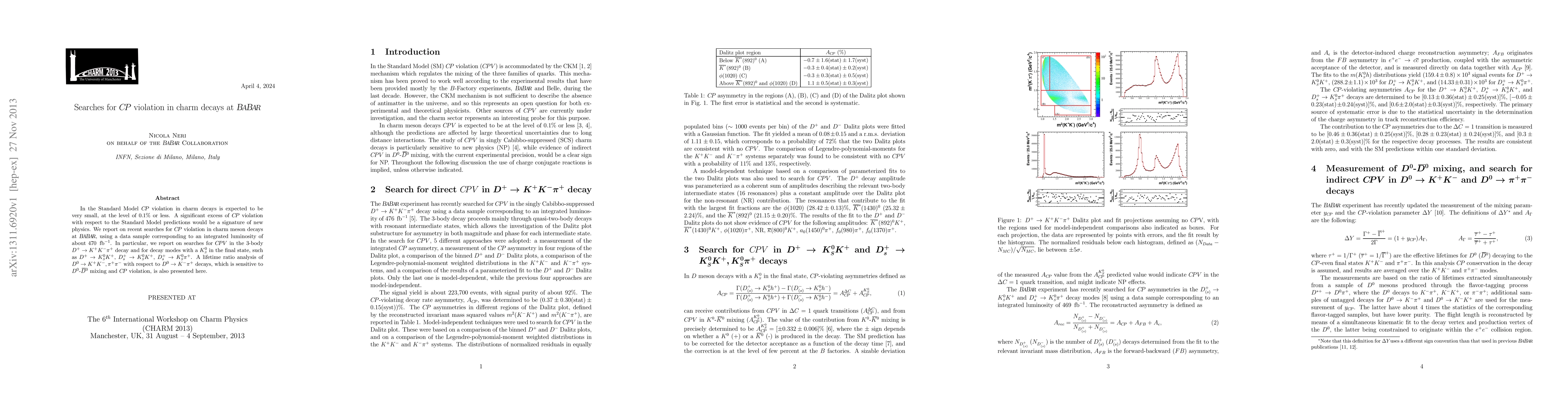 This paper reports on searches for CP violation in charm meson decays at the BABAR experiment, using a data sample of 470 inverse femtobarns. It focuses on decays such as $\Dp\to\Kp\Km\pip$ and $\Dz\to\Kp\Km, \pip\pim$ with respect to $\Dz\to\Km\pip$, seeking deviations from Standard Model predictions that could indicate new physics.