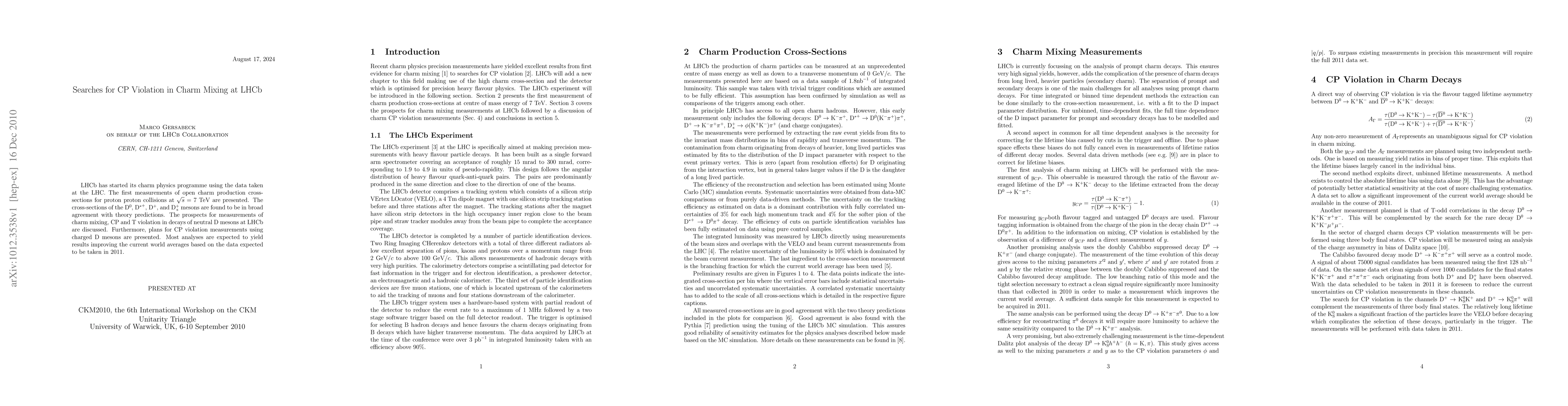 LHCb has started its charm physics programme using the data taken at the LHC. The first measurements of open charm production cross-sections for proton proton collisions at $\sqrt{s}=7 \tev$ are presented. The cross-sections of the \PDzero, $\PDstar^+$, \PDplus, and \PDsplus mesons are found to be in broad agreement with theory predictions. The prospects for measurements of charm mixing, CP and T violation in decays of neutral \PD mesons at LHCb are discussed. Furthermore, plans for CP violation measurements using charged \PD mesons are presented. Most analyses are expected to yield results improving the current world averages based on the data expected to be taken in 2011.