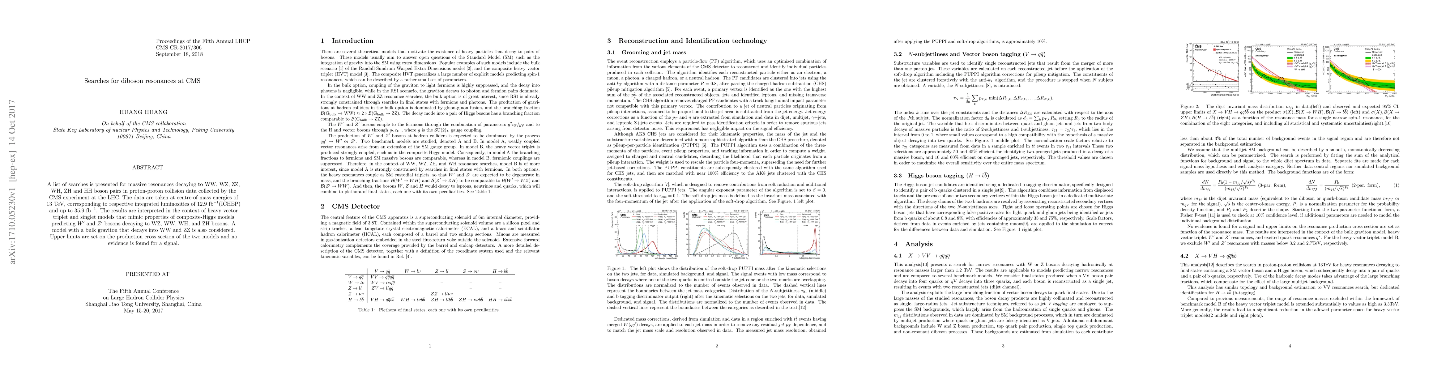 The paper presents searches for massive resonances decaying into various boson pairs using CMS data from LHC collisions at 13TeV, with luminosities up to 35.9/fb. No significant evidence for new resonances was found, and upper limits were set on production cross-sections for heavy vector triplet/singlet models and a bulk graviton model, which are relevant to composite-Higgs scenarios.